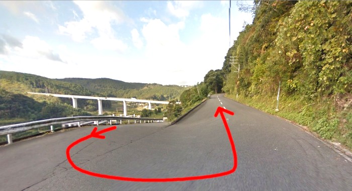 登りきったところで鋭角の急カーブをまがり、そのまま道なり1.5kmほど山道を登ります。