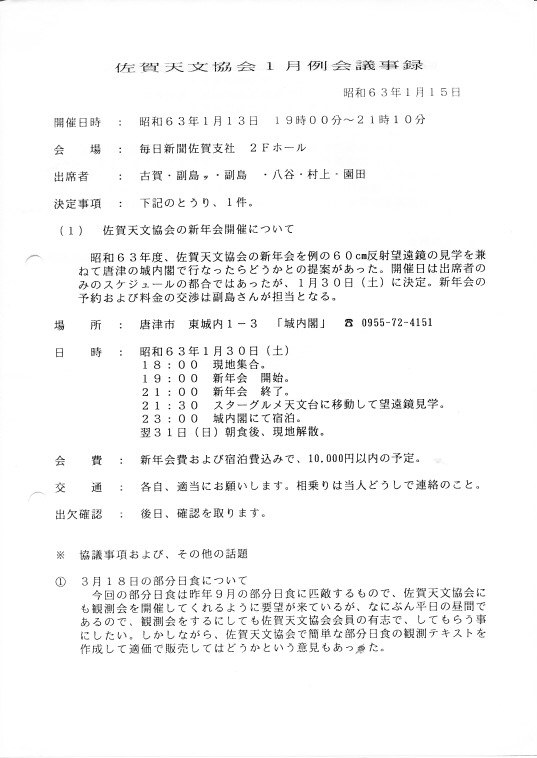 | 30,31日 | 新年会 | 唐津 城内閣、天文館 | スターーグルメ天文台60cm反射望遠鏡の見学 | ||