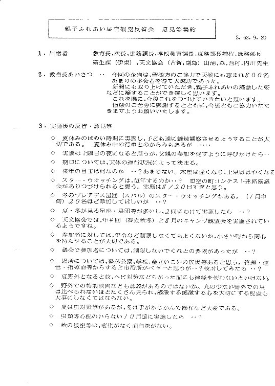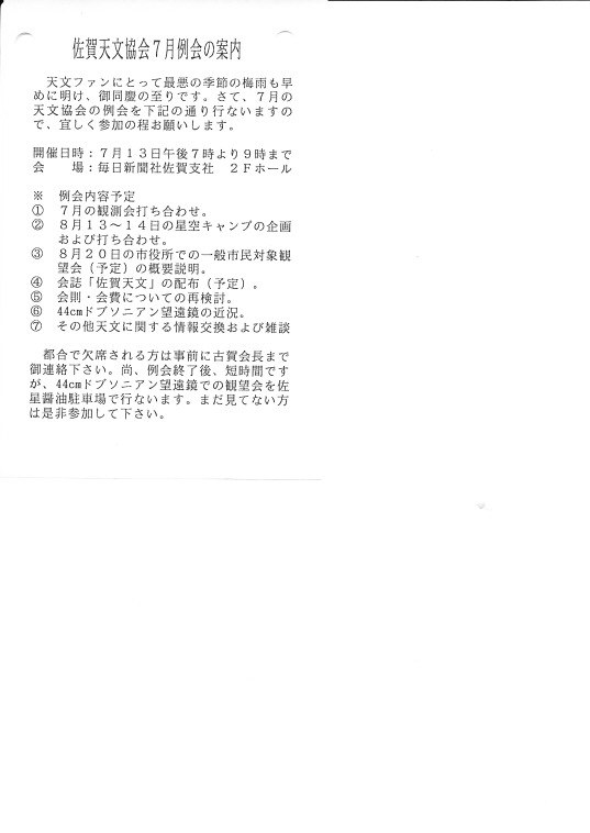 | 19日 | 親子ふれ合い星空観望会の反省会 | 佐賀市役所 会議室 | 15:30〜 | 古賀、副島 資料→1、2、3、4 | |