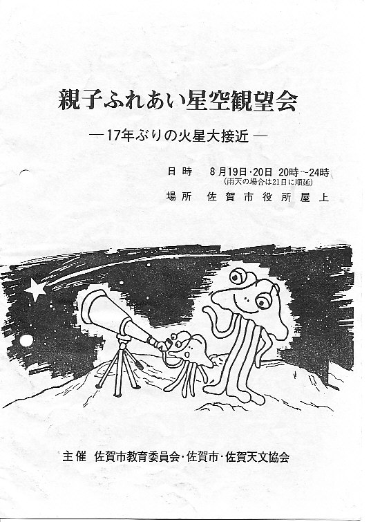 | 19,20日 | 親子ふれ合い星空観望会 | 佐賀市役所屋上 | 17年ぶりの火星大接近 780名 | 古賀、副島、村上、園田、野田、松林 資料→1、2、3、4 、5、6 |