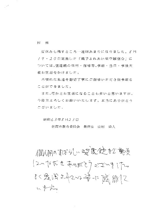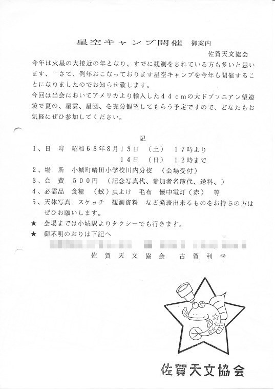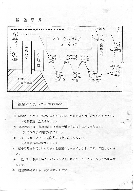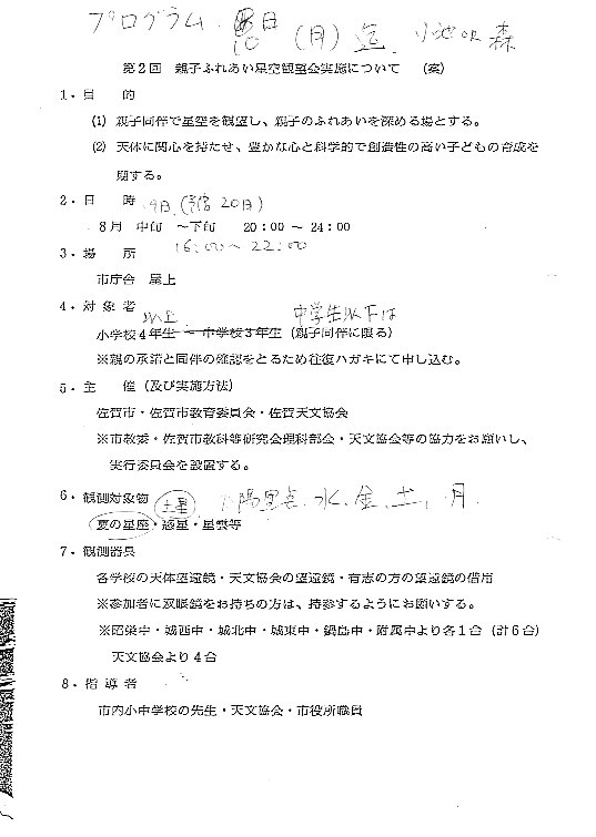 | 13,14日 | 第5回星空キャンプ | 晴田小学校川内分校 | 環境庁スターウォッチングにも参加 | 画像⇒ 1 配布資料⇒PDF | |
