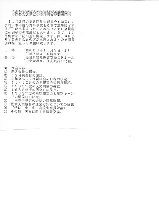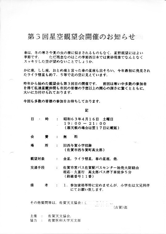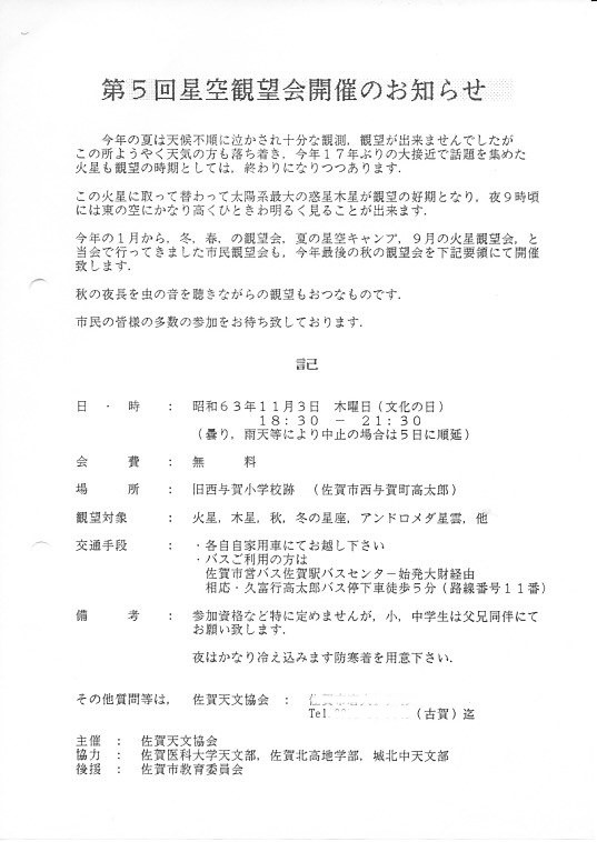 | 11月 | 3日 | 第5回市民星空観望会 | 旧西与賀小学校跡 | 協力:佐賀医大天文部、佐賀北高地学部、城北中天文部 | 画像⇒ 1 |