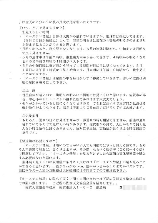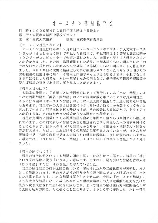| 29日 | オースチン彗星観測会 | 城西中学校 | 後援:佐賀市教育員会 約250名 | 資料→1,2 | |