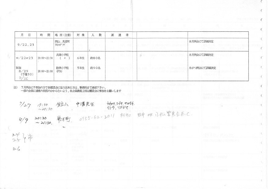 | 24日(火) | 観望会 | 川上 下田キャンプ場 | ボーイスカウト 約30名 | 内川、渋谷、近藤、副島 | |