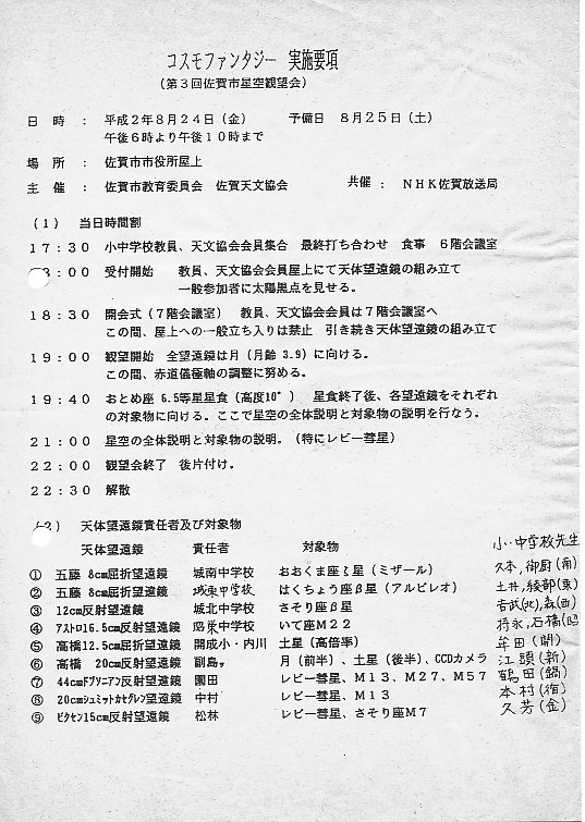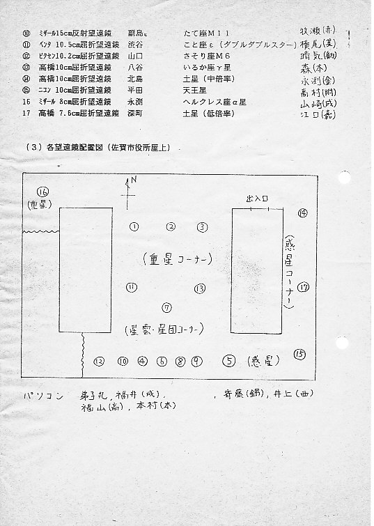 | 24日 | 佐賀コスモファンタジー | 佐賀市庁舎屋上 | 佐賀市教育委員会 市民 約400名 | 園田、松林、北島、小柳、近藤、渋谷、副島、中村、永渕、八谷、深町、山口、岩本、副島ツ、江頭 資料→1、2、3、4、5、6、7 | |