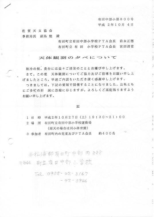 | 27日 | 観望会 | 有田中部小学校グランド | 有田町内の児童、PTA会員 約400名 | 資料→1 | |