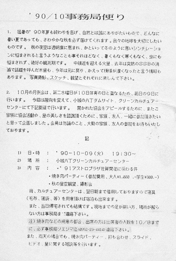 | 9日 | 10月例会 | 八丁ダムカルチャーセンター | 秋の星空観測&焼肉パーティー | ||