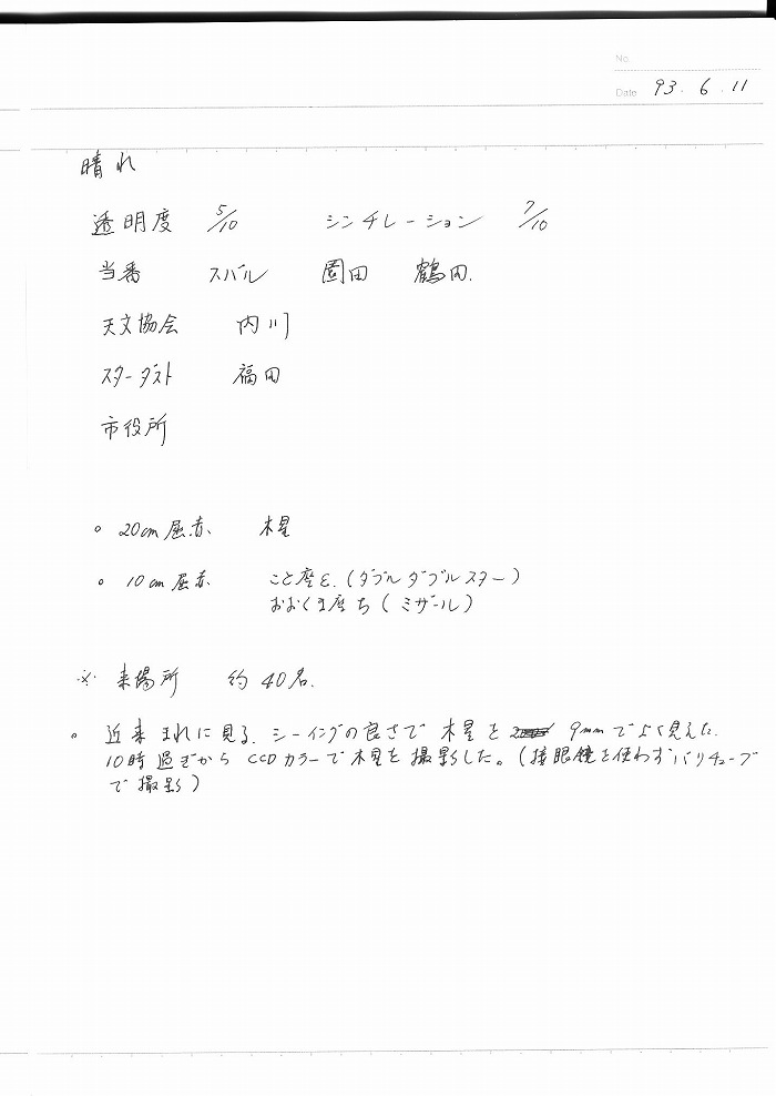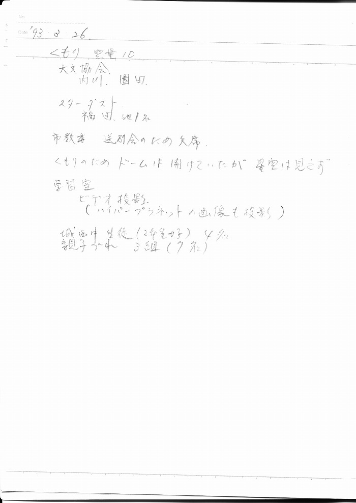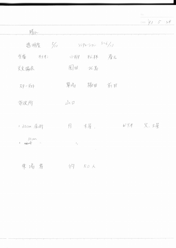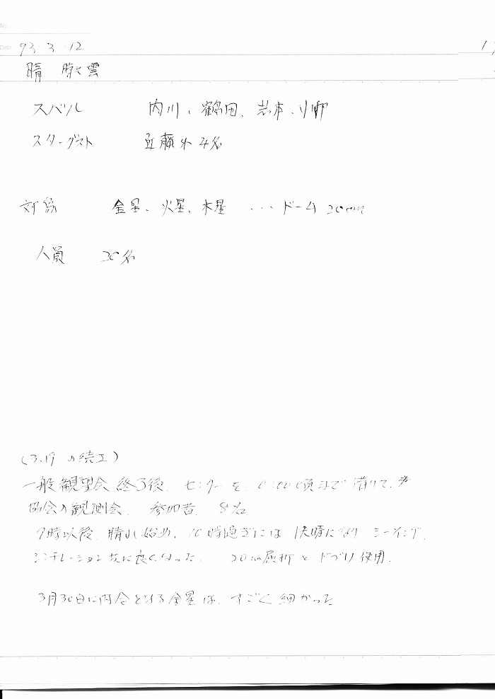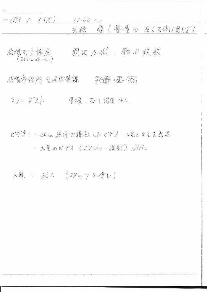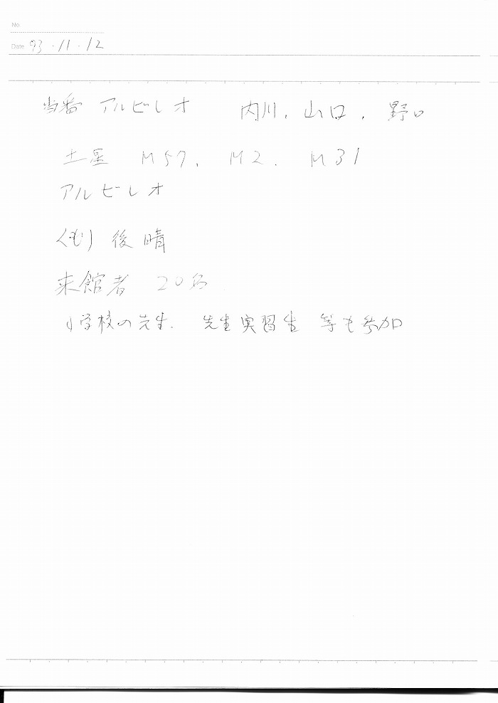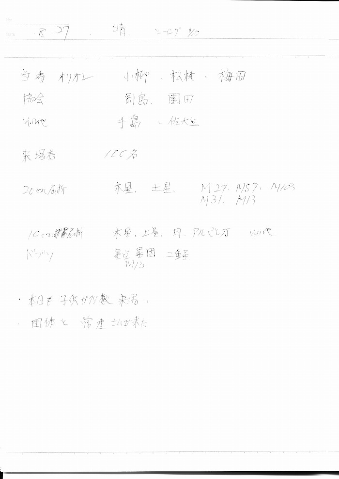 | 12日(金) | 天体観望会 | 西与賀コミニュティーセンター | 記録ノート画像⇒ 1 内川、山口、野口 | ||