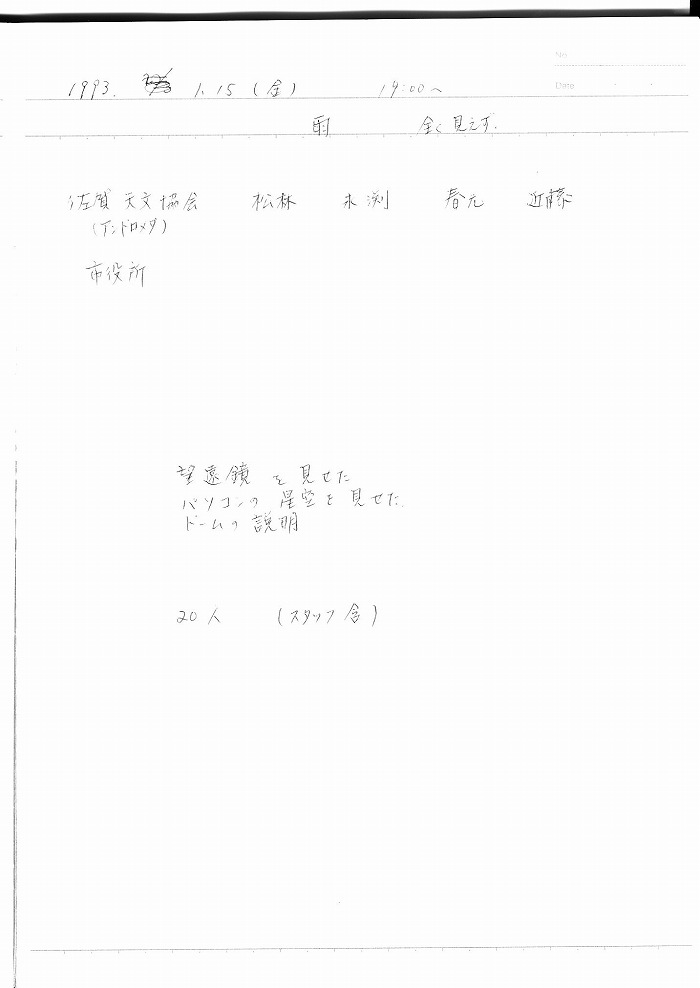 | 15日(金) | 天体観望会 | 西与賀コミニュティーセンター | 記録ノート画像⇒ 1 松林、永渕、春元、近藤 | ||
