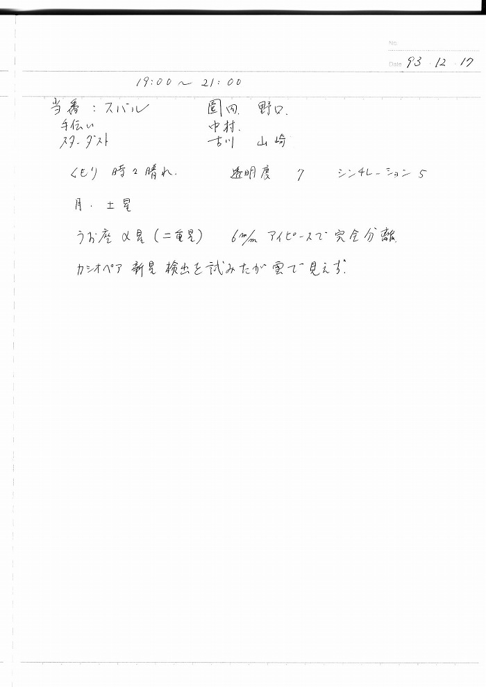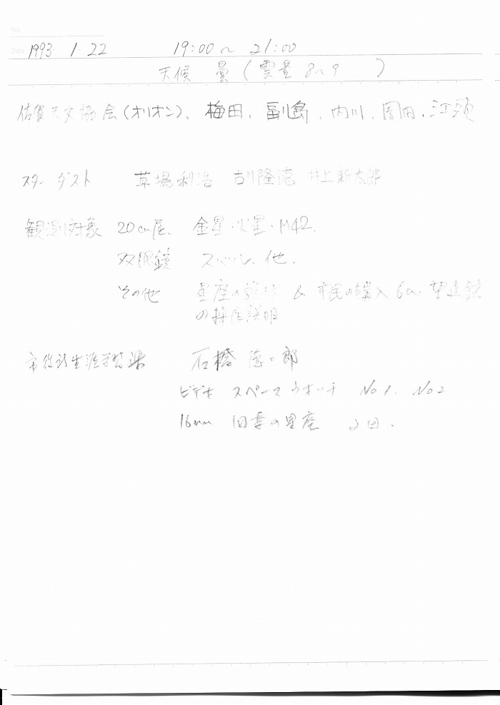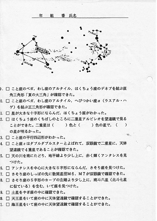 | 17日(金) | 天体観望会 | 西与賀コミニュティーセンター | 記録ノート画像⇒ 1 園田、野口、中村、古川、山崎 | ||