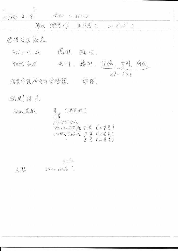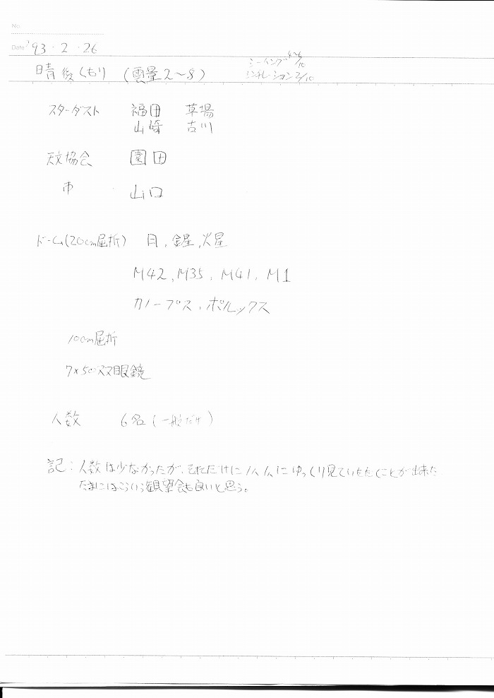 | 2月 | 5日(金) | 天体観望会 | 西与賀コミニュティーセンター | 記録ノート画像⇒ 1 園田、鶴田、内川、草場、古川、前田 | |