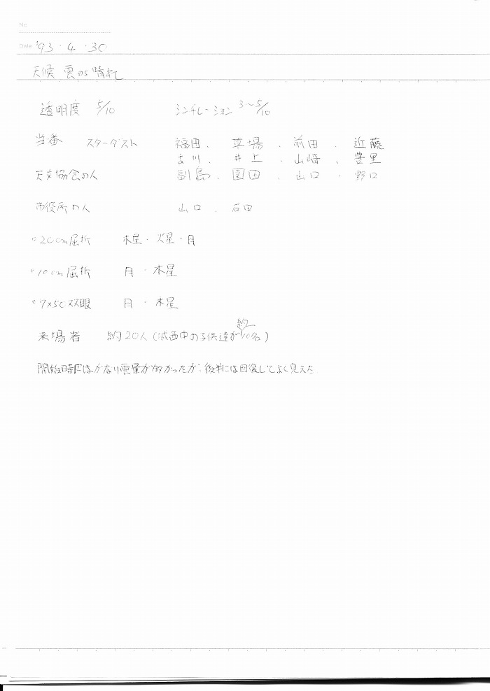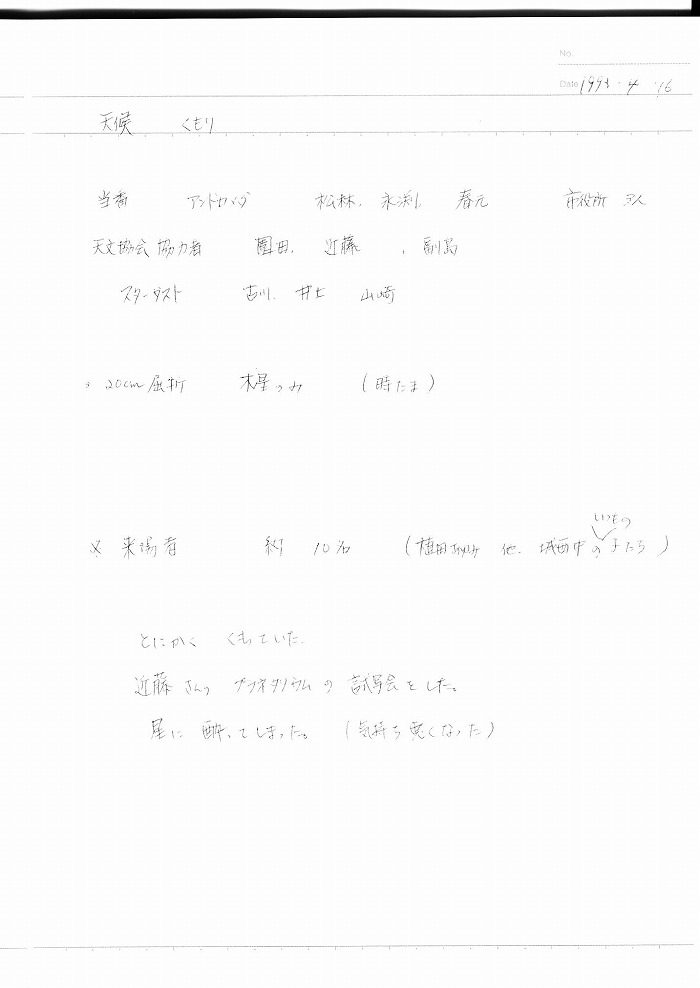 | 4月 | 2日(金) | 天体観望会 | 西与賀コミニュティーセンター | 記録ノート画像⇒ 1 副島、園田、藤井、野口、福田、古川、草場 | |