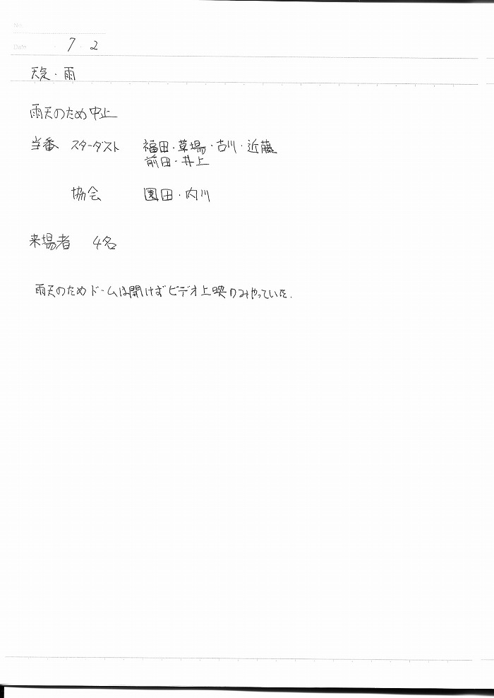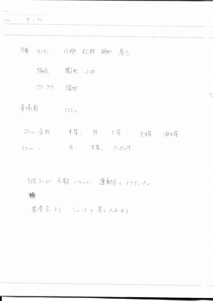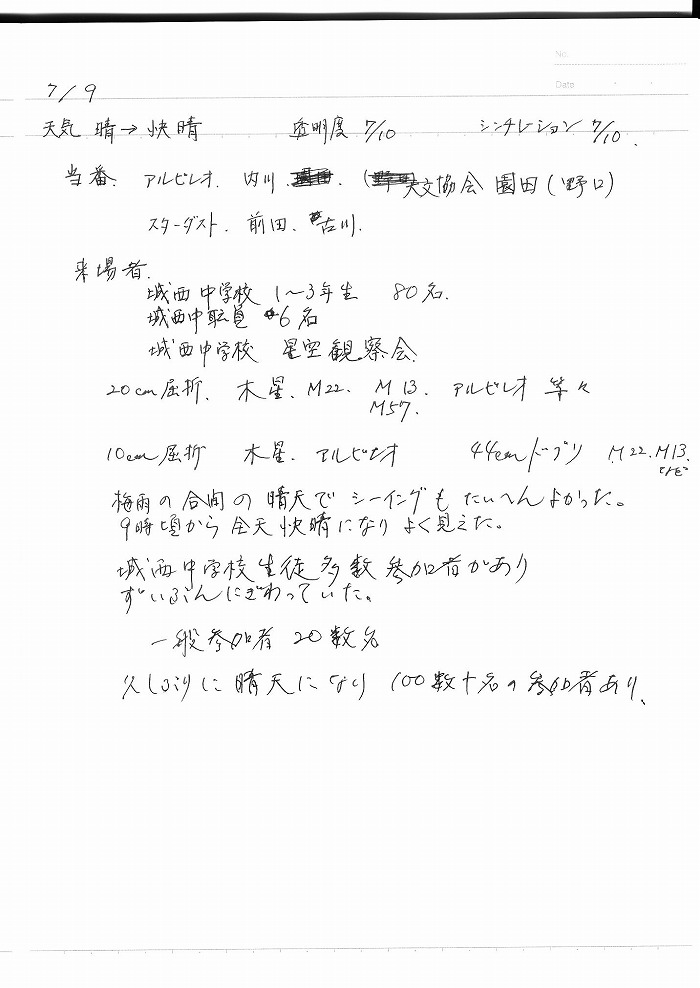 | 7月 | 2日(金) | 天体観望会 | 西与賀コミニュティーセンター | 記録ノート画像⇒ 1 福田、草場、古川、近藤、前田、井上、園田、内川 | |