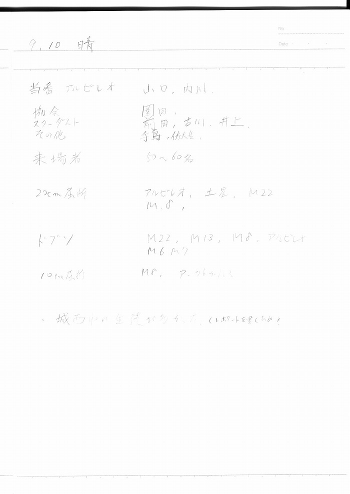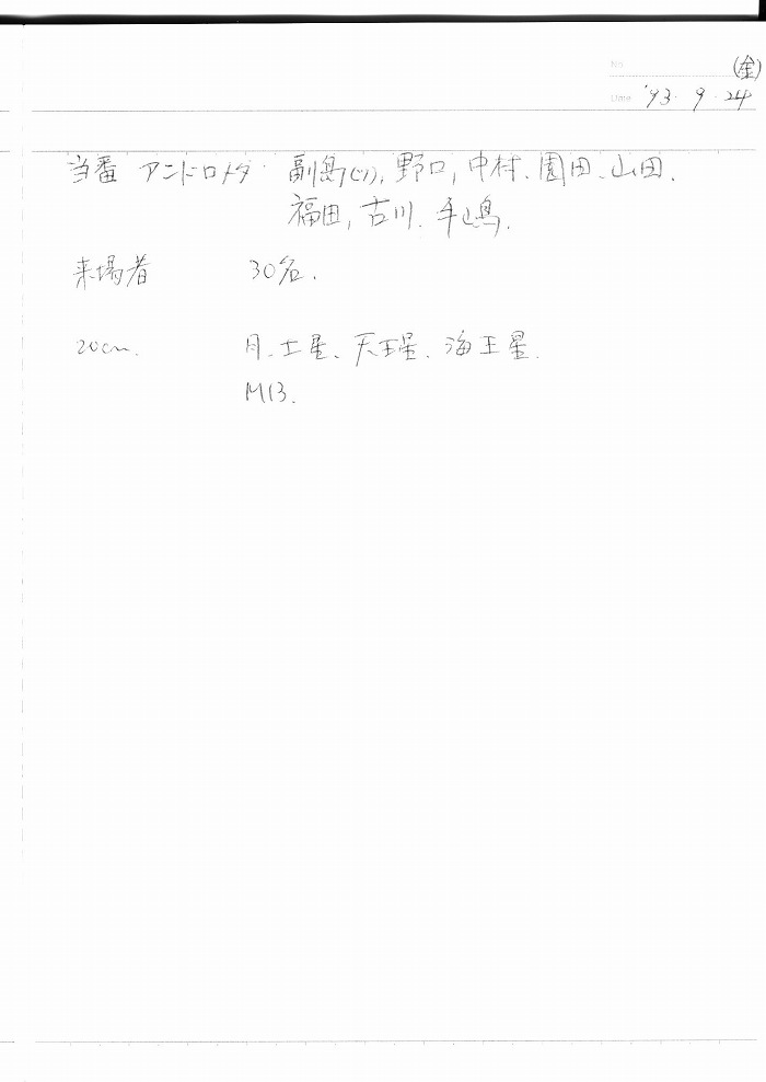 | 9日(金) | 天体観望会 | 西与賀コミニュティーセンター | 記録ノート画像⇒ 1 園田、小柳、福田、古川、草場、井上 | ||