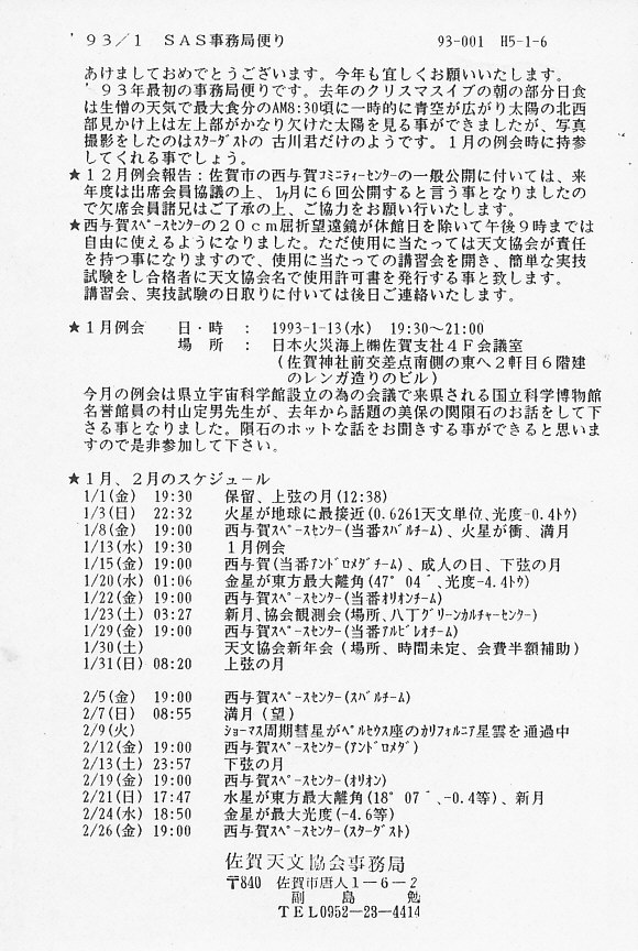 | 1月 | 6日(水) | SAS事務局だより発送 | 画像⇒ 1 | ||