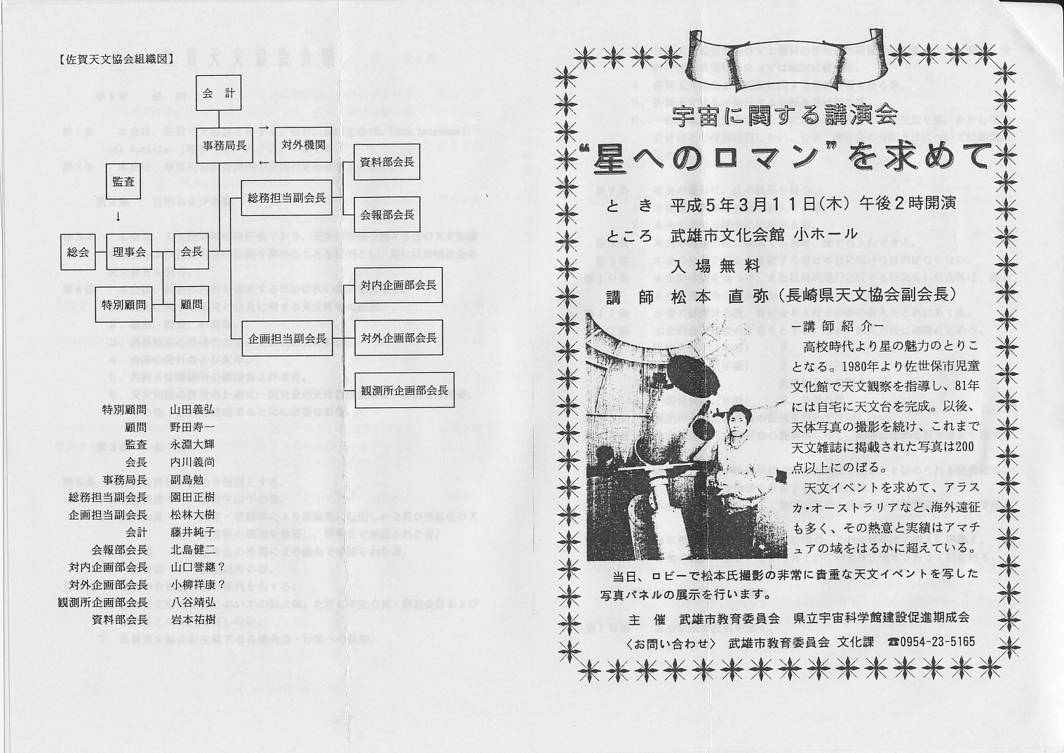 | 11日(木) | 講演会 | 武雄市文化会館 | 松本直弥氏「星へのロマンをもとて」 | 主催:武雄市教育委員会&県立宇宙科学館建設促進期成会 | |