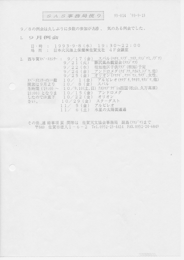 | 9日(土) | SAS事務局だより発送 | 日本火災 4F会議室 | 画像⇒ 1 | ||