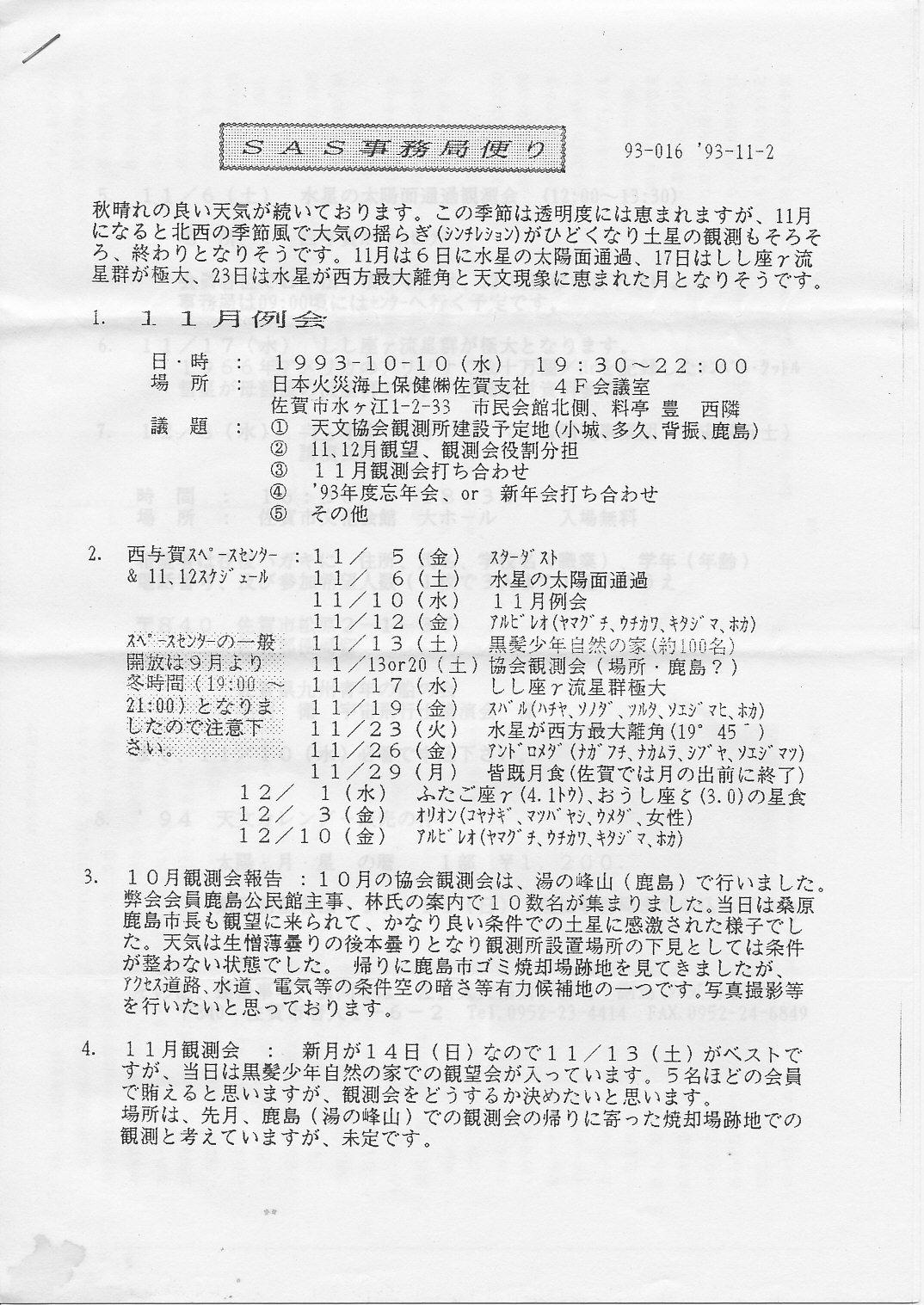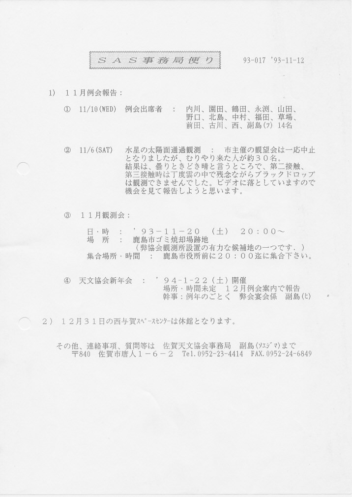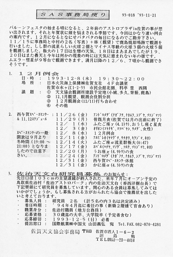 | 11月 | 2日 | SAS事務局だより発送 | 画像⇒ 1 、2 | ||