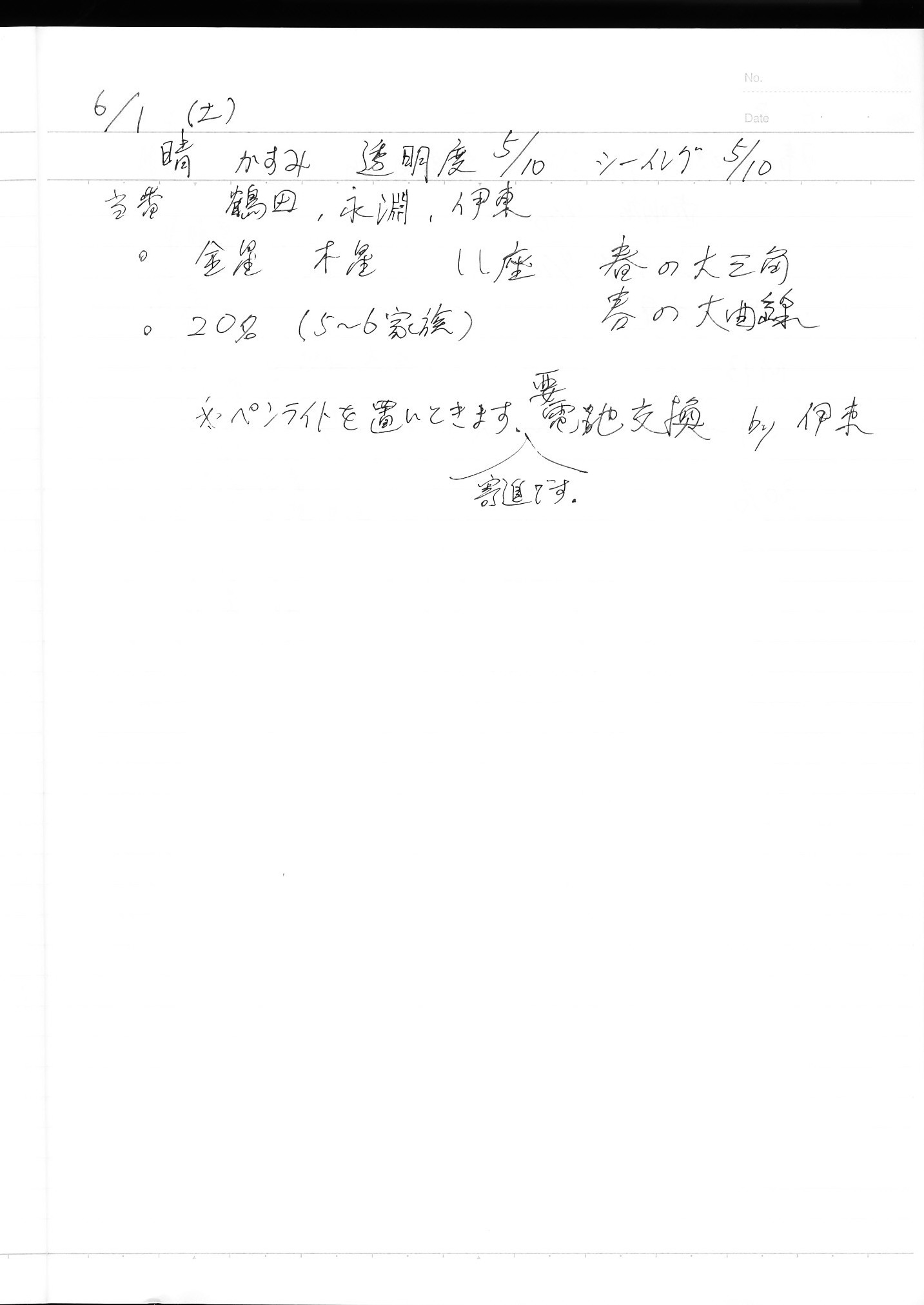 | 6月 | 1日(土) | 天体観望会 | 西与賀コミニュティーセンター | 記録ノート画像⇒ 1 鶴田、永渕、伊東 | |