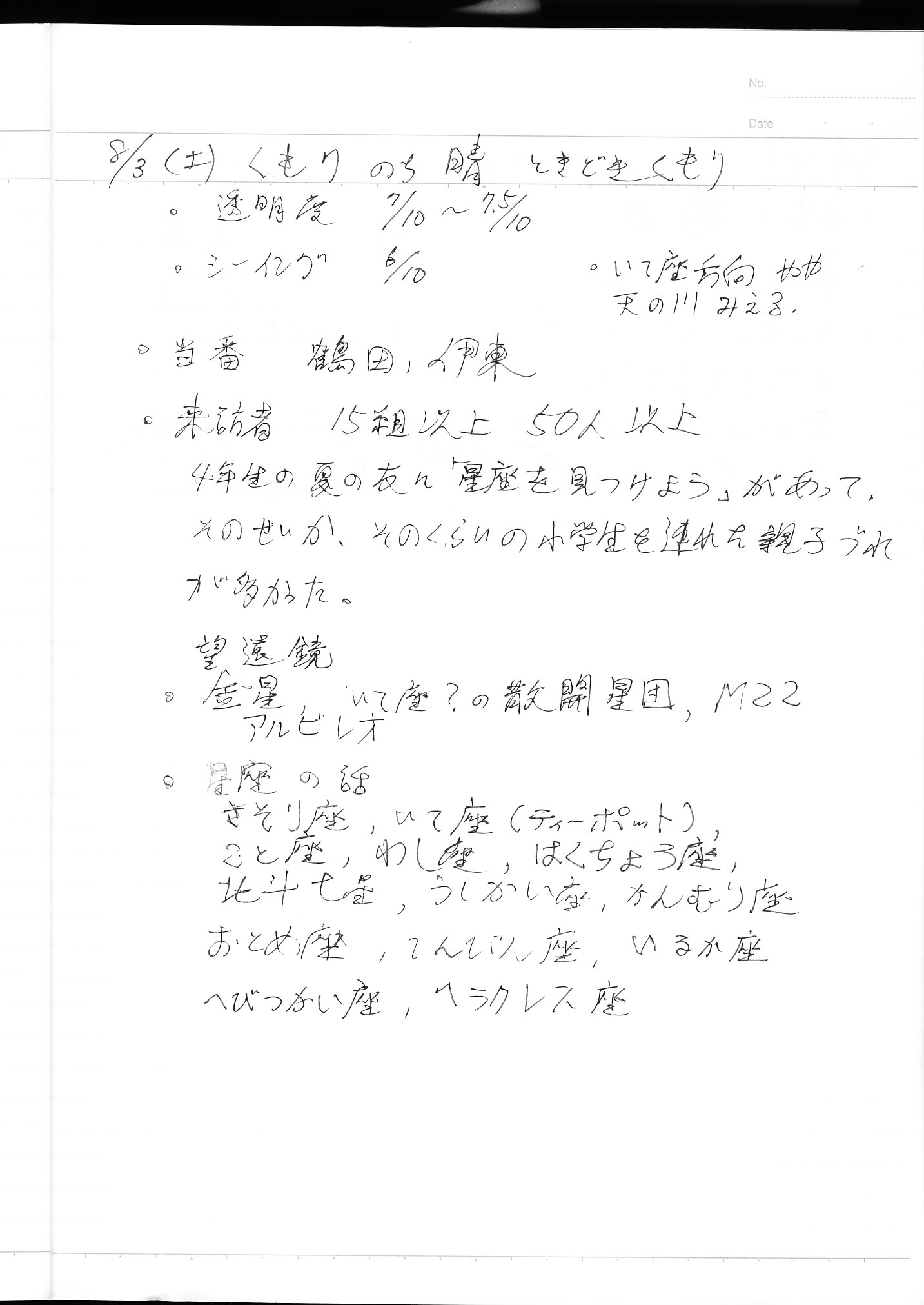 | 8月 | 3日(土) | 天体観望会 | 西与賀コミニュティーセンター | 記録ノート画像⇒ 1 鶴田、伊東 | |