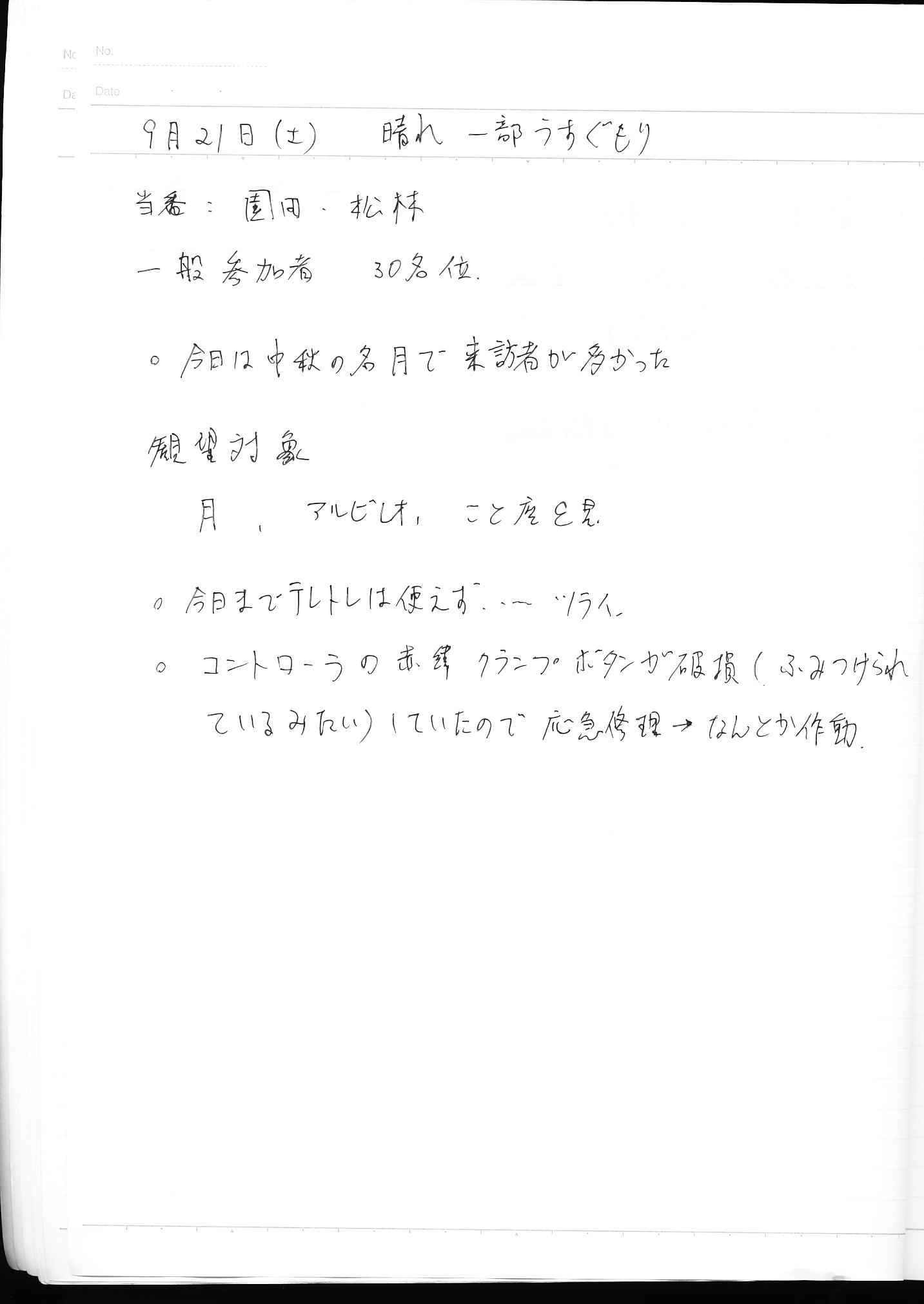 | 21日(土) | 天体観望会 | 西与賀コミニュティーセンター | 記録ノート画像⇒ 1 園田、松林 | ||