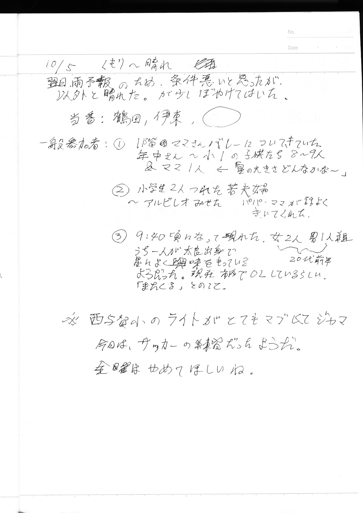 | 10月 | 5日(土) | 天体観望会 | 西与賀コミニュティーセンター | 記録ノート画像⇒ 1 鶴田、伊東 | |