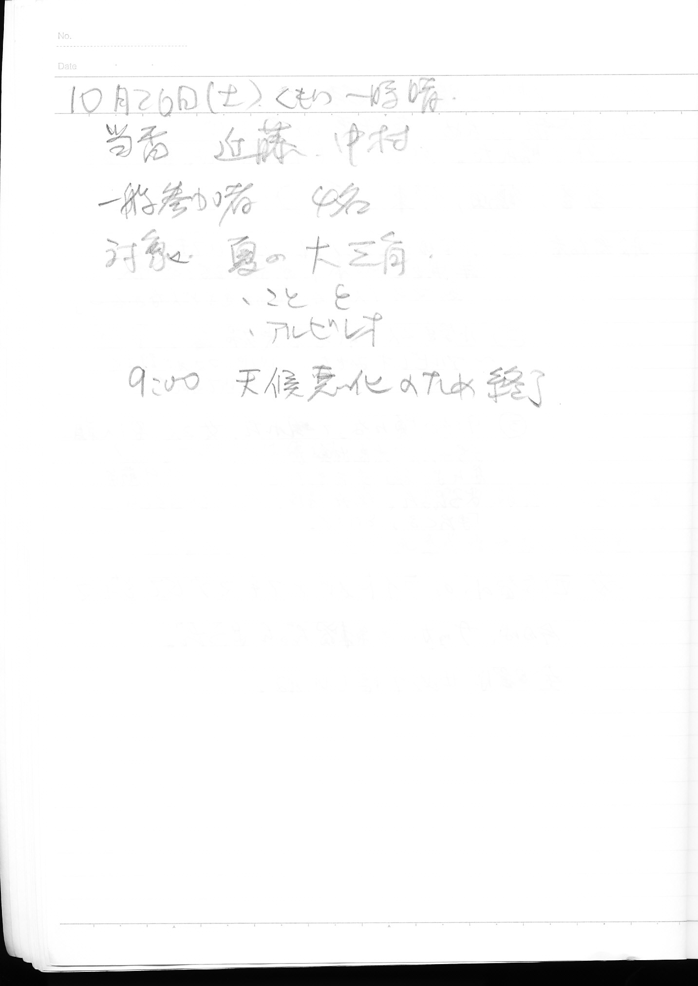| 26日(土) | 天体観望会 | 西与賀コミニュティーセンター | 記録ノート画像⇒ 1 近藤、中村 | ||