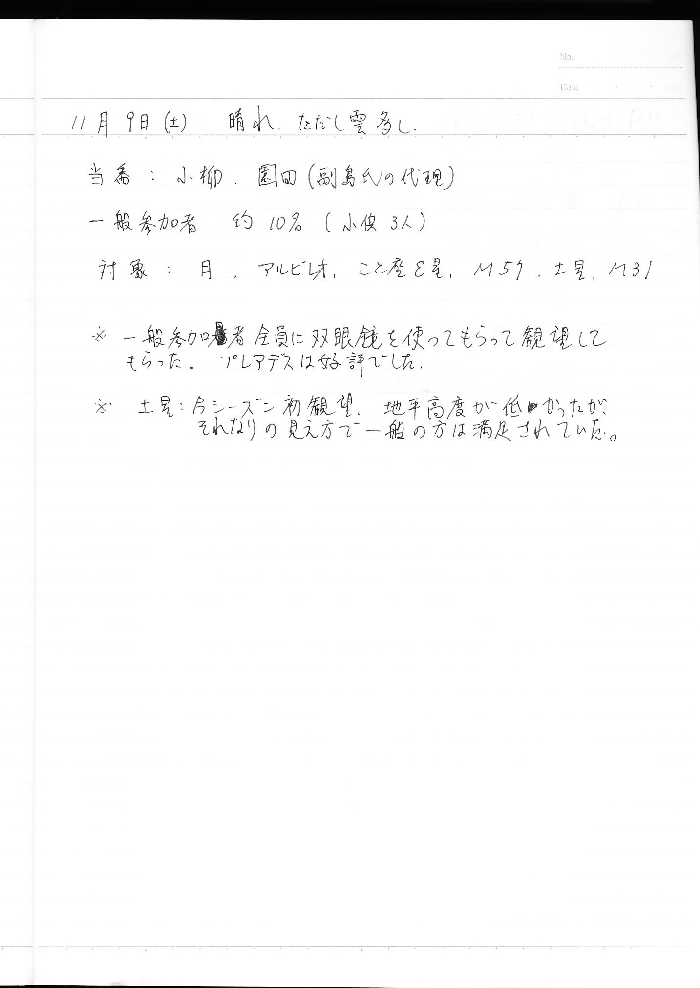 | 9日(土) | 天体観望会 | 西与賀コミニュティーセンター | 記録ノート画像⇒ 1 小柳、園田 | ||