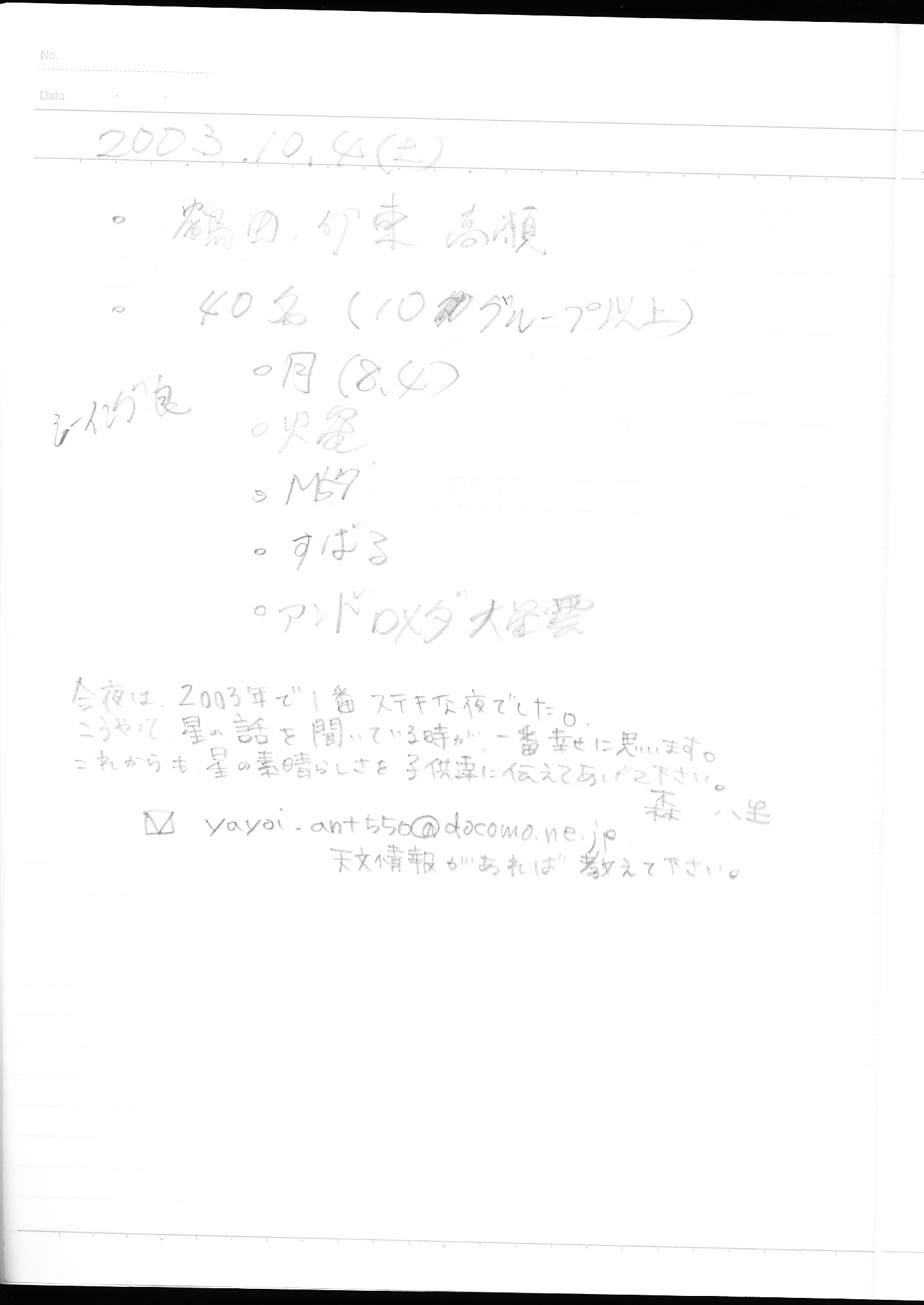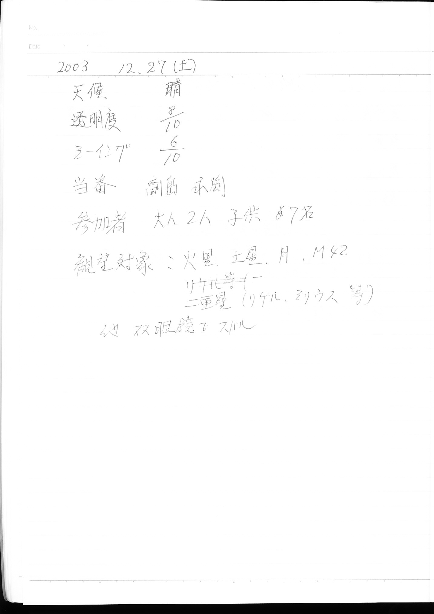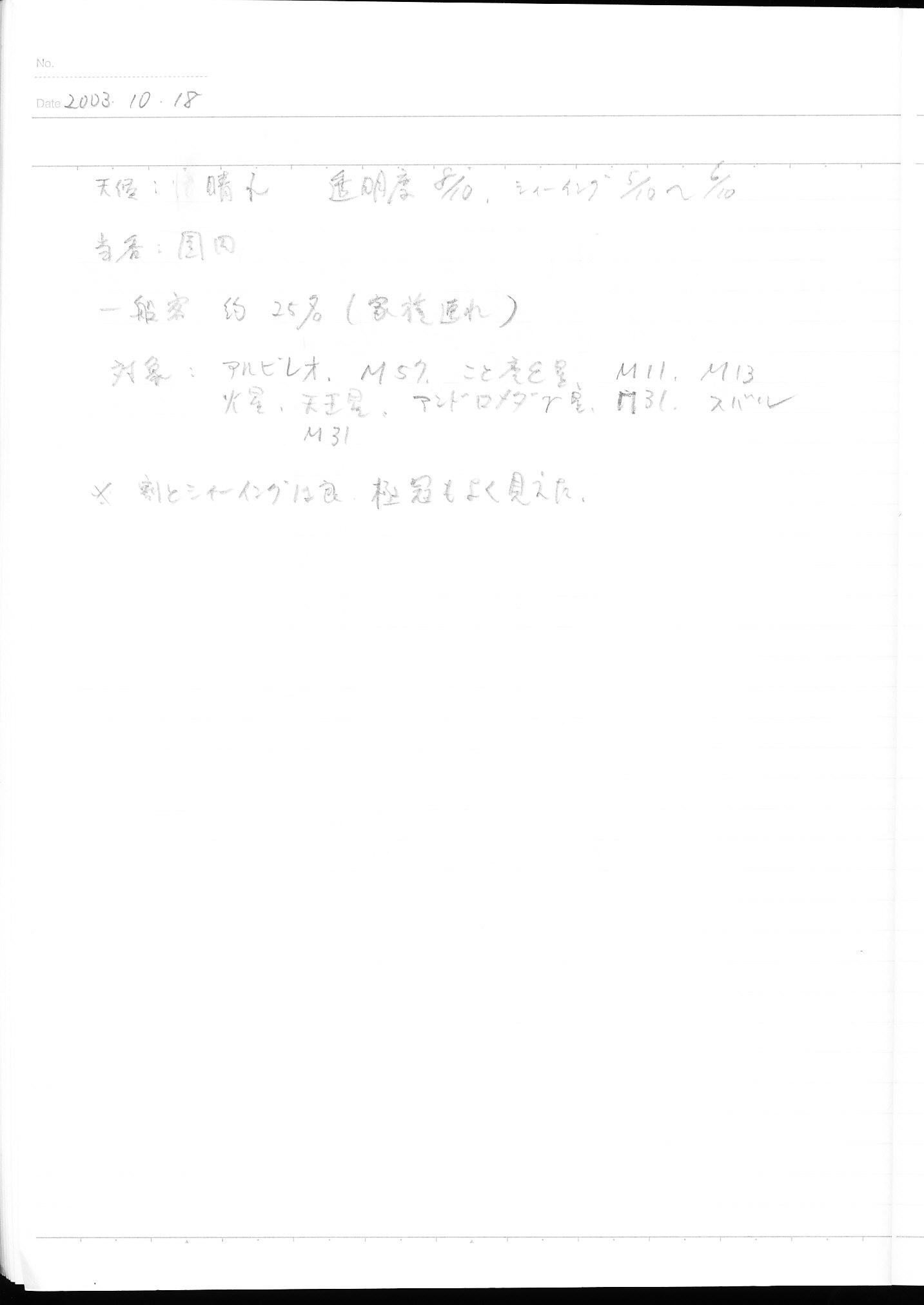 | 17日(土) | 天体観望会 | 西与賀コミニュティーセンター | 記録ノート画像⇒ 1 近藤 | ||