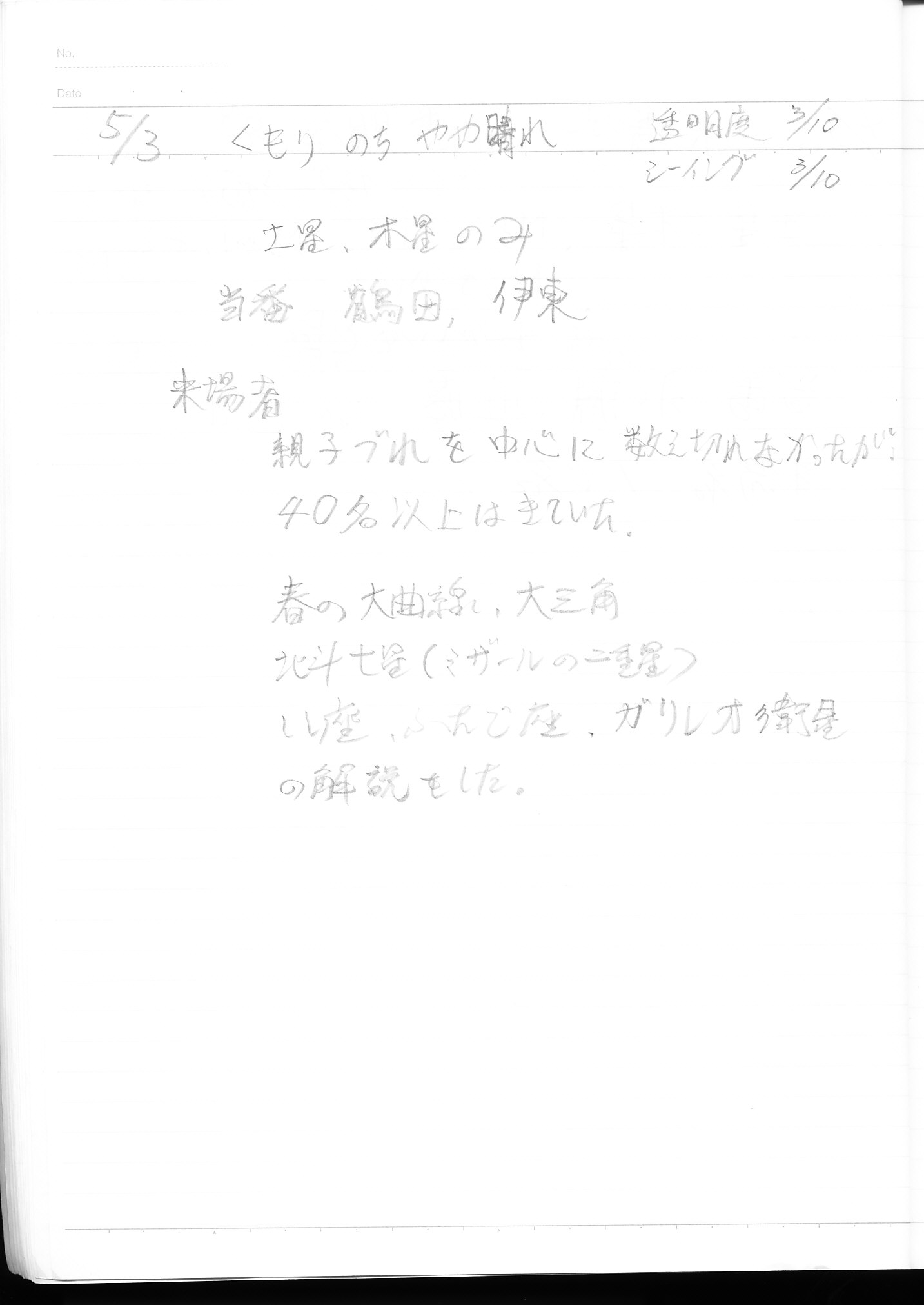 | 5月 | 3日(土) | 天体観望会 | 西与賀コミニュティーセンター | 記録ノート画像⇒ 1 鶴田、伊東 | |