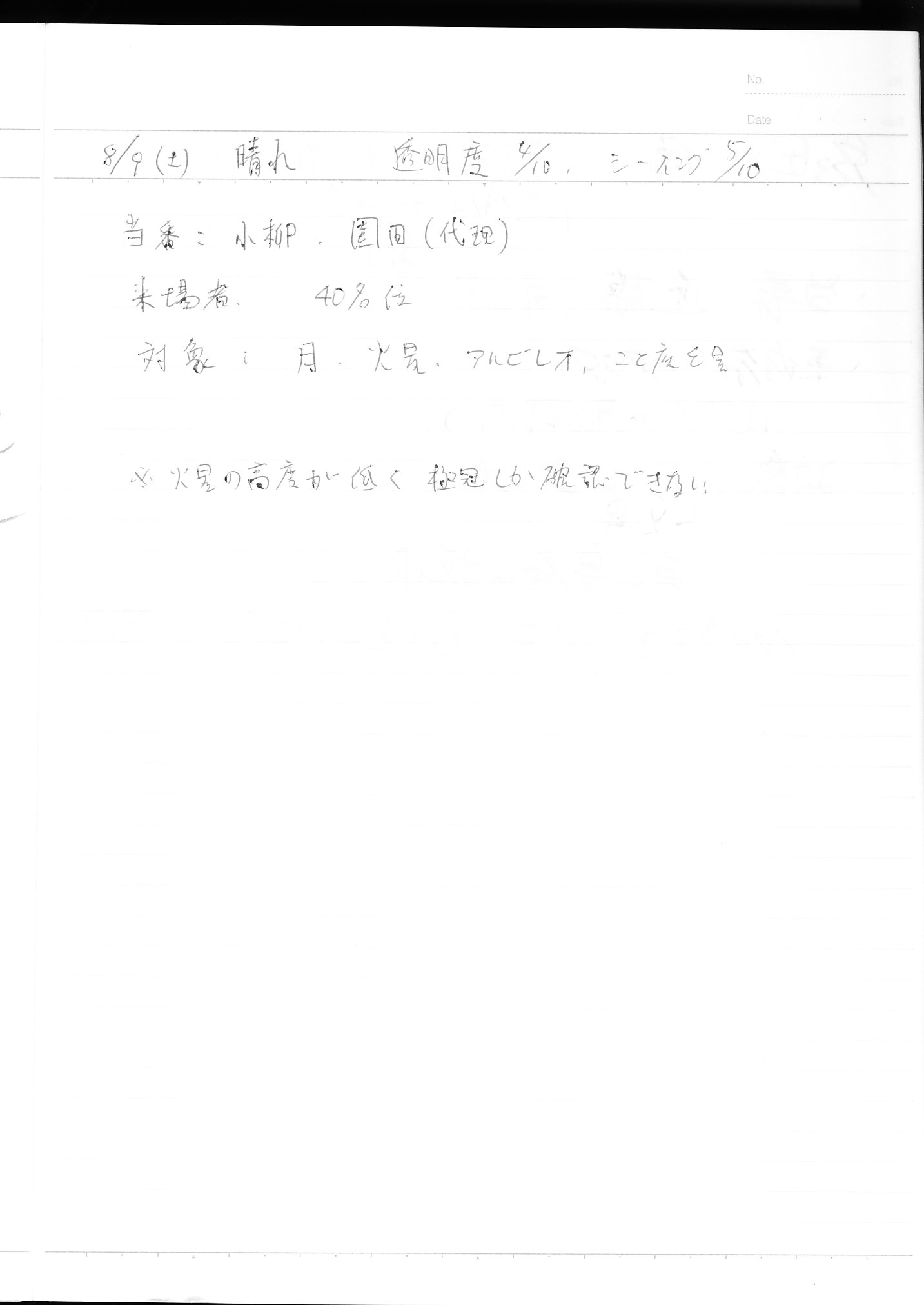 | 8月 | 2日(土) | 天体観望会 | 西与賀コミニュティーセンター | 記録ノート画像⇒ 1 鶴田、伊東、園田 | |