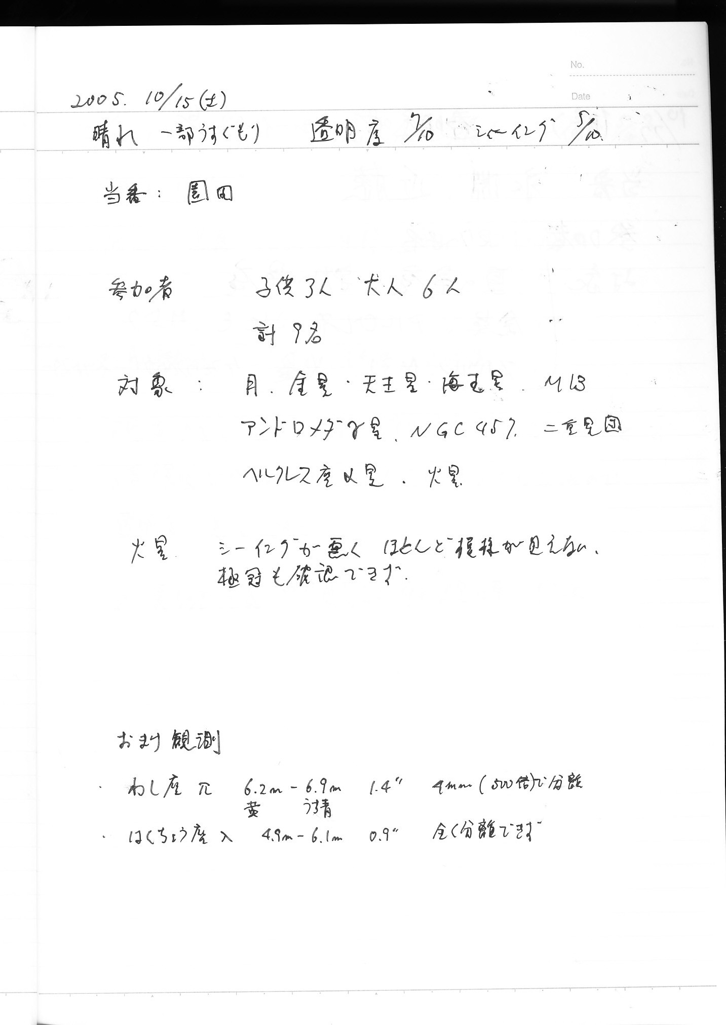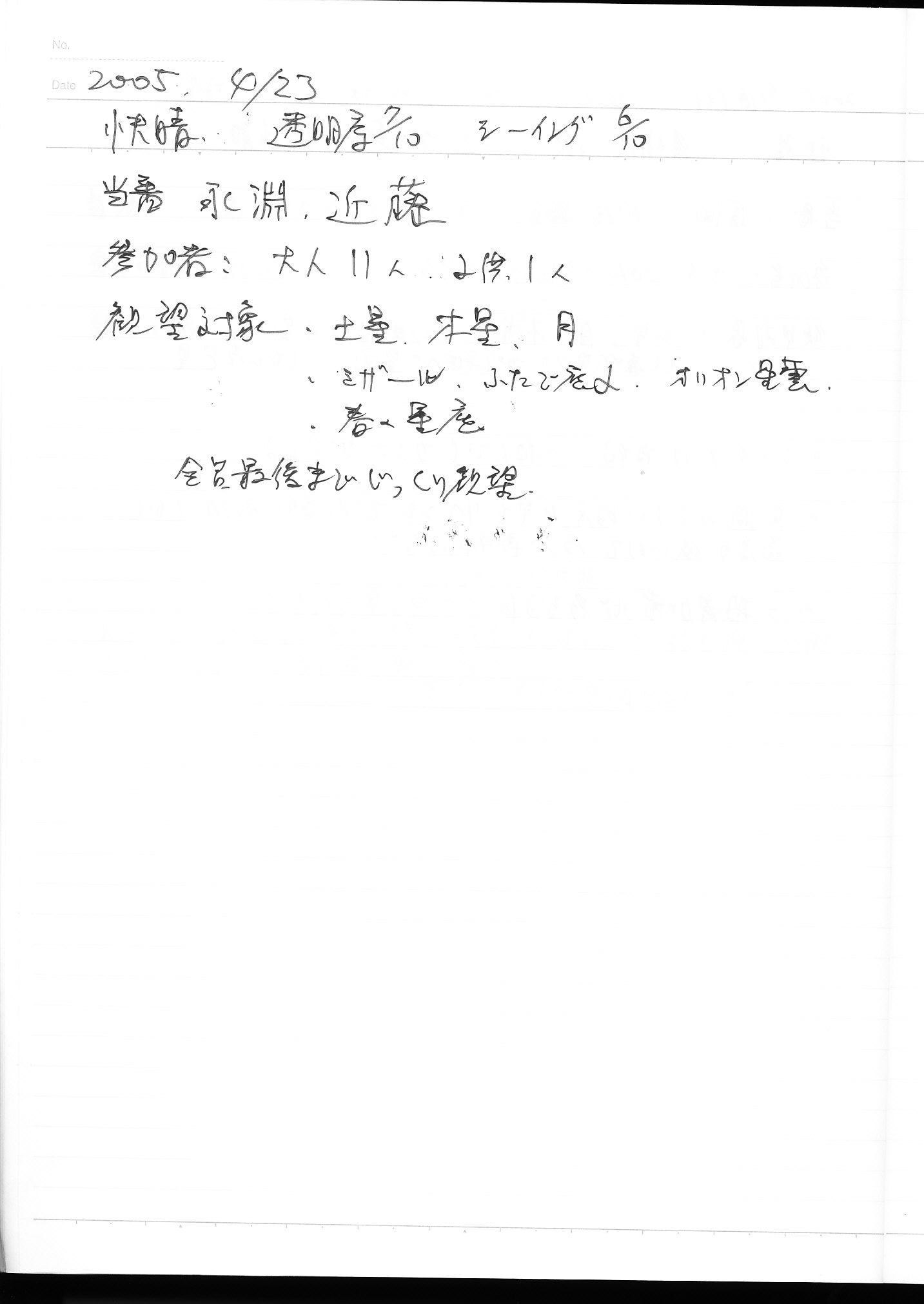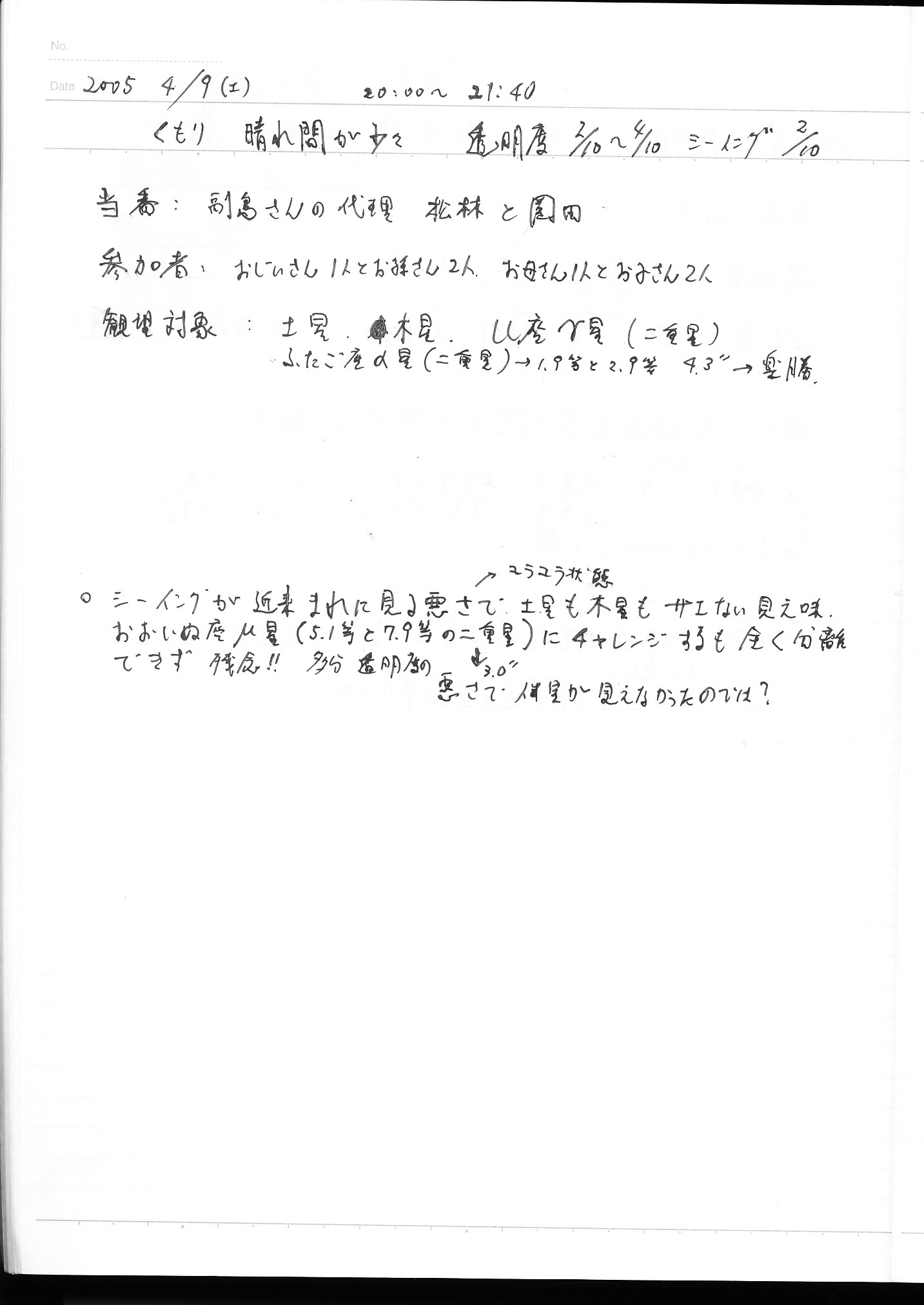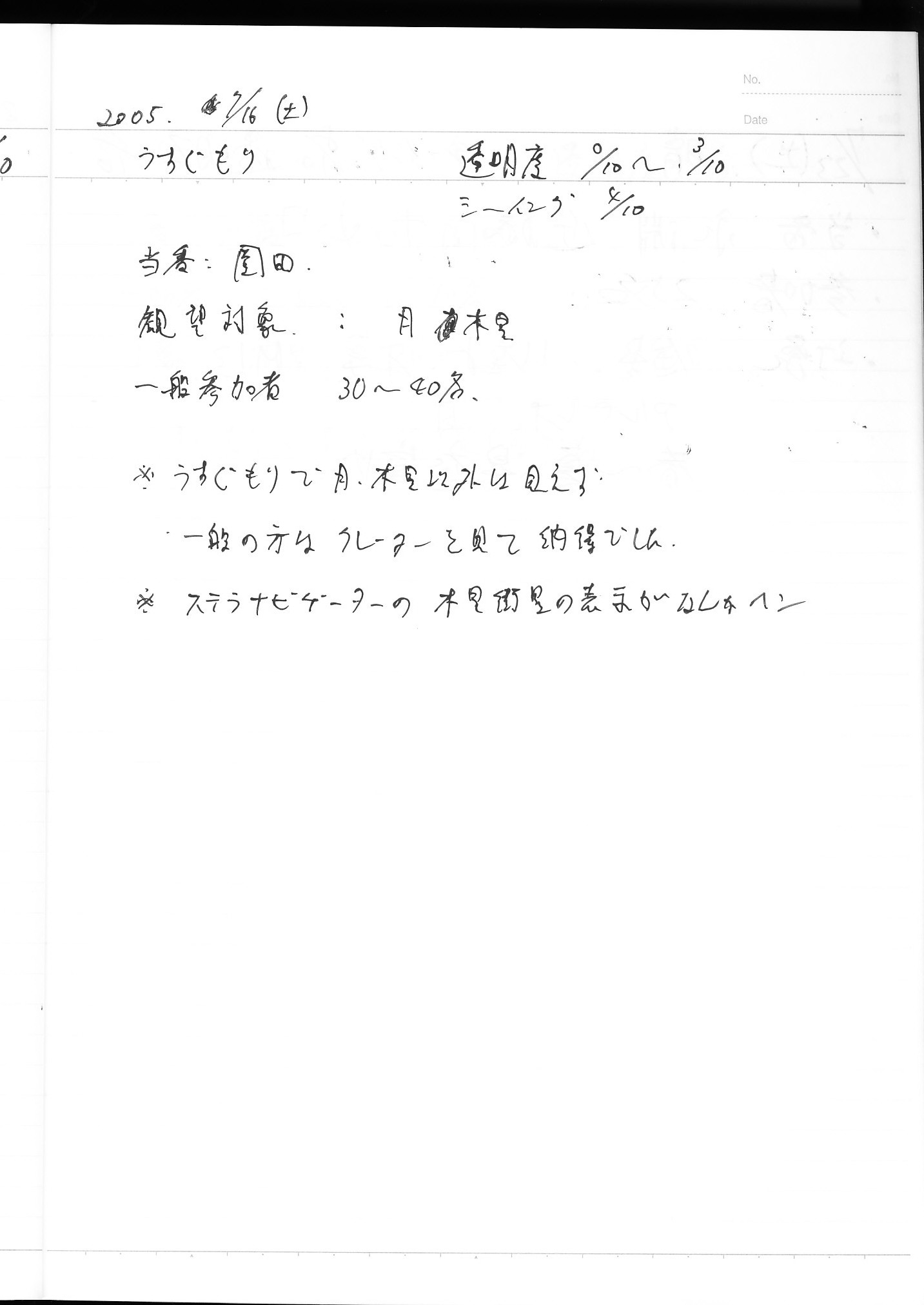 | 9日(土) | 天体観望会 | 西与賀コミニュティーセンター | 記録ノート画像⇒ 1 松林、園田 | ||