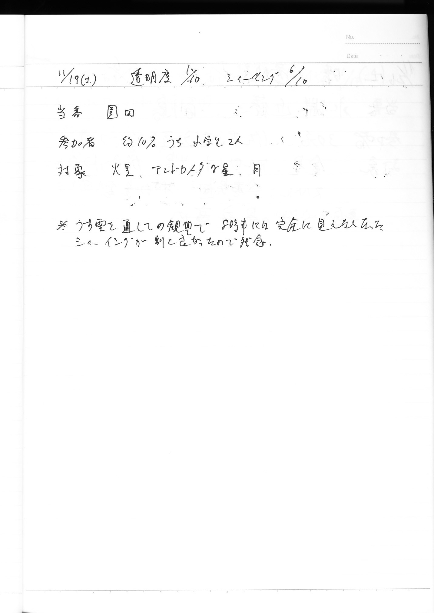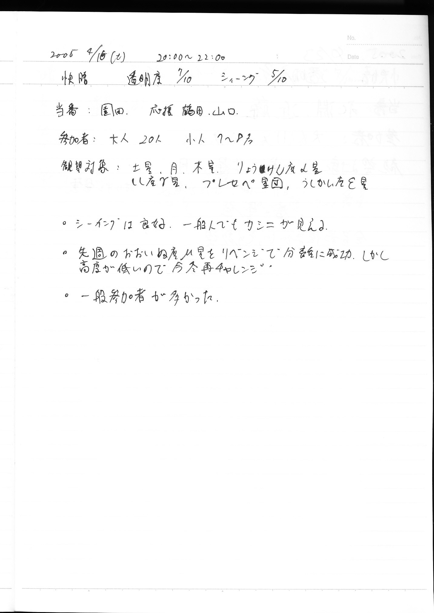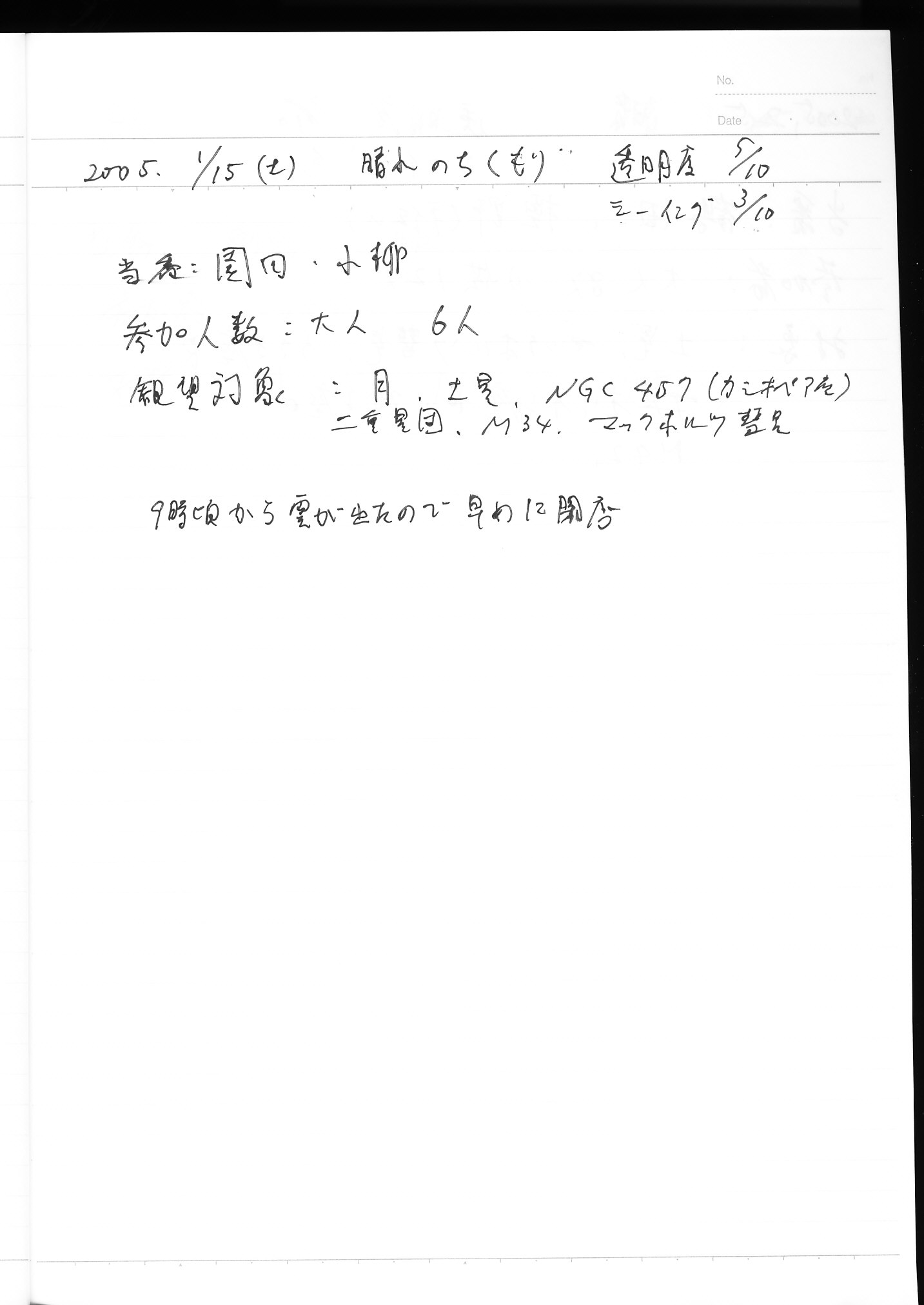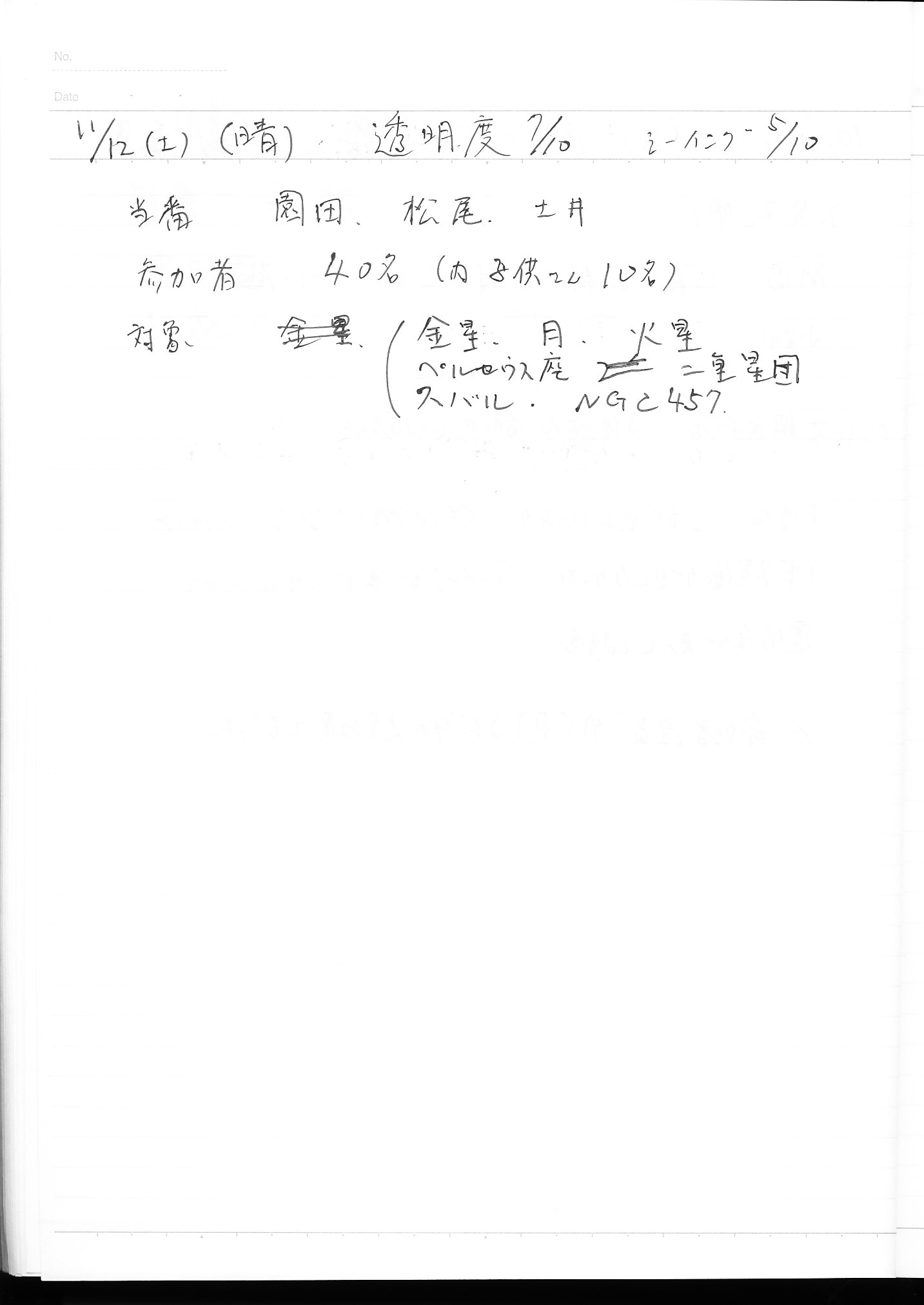 | 9日(土) | 天体観望会 | 西与賀コミニュティーセンター | 記録ノート画像⇒ 1 松林、園田 | ||