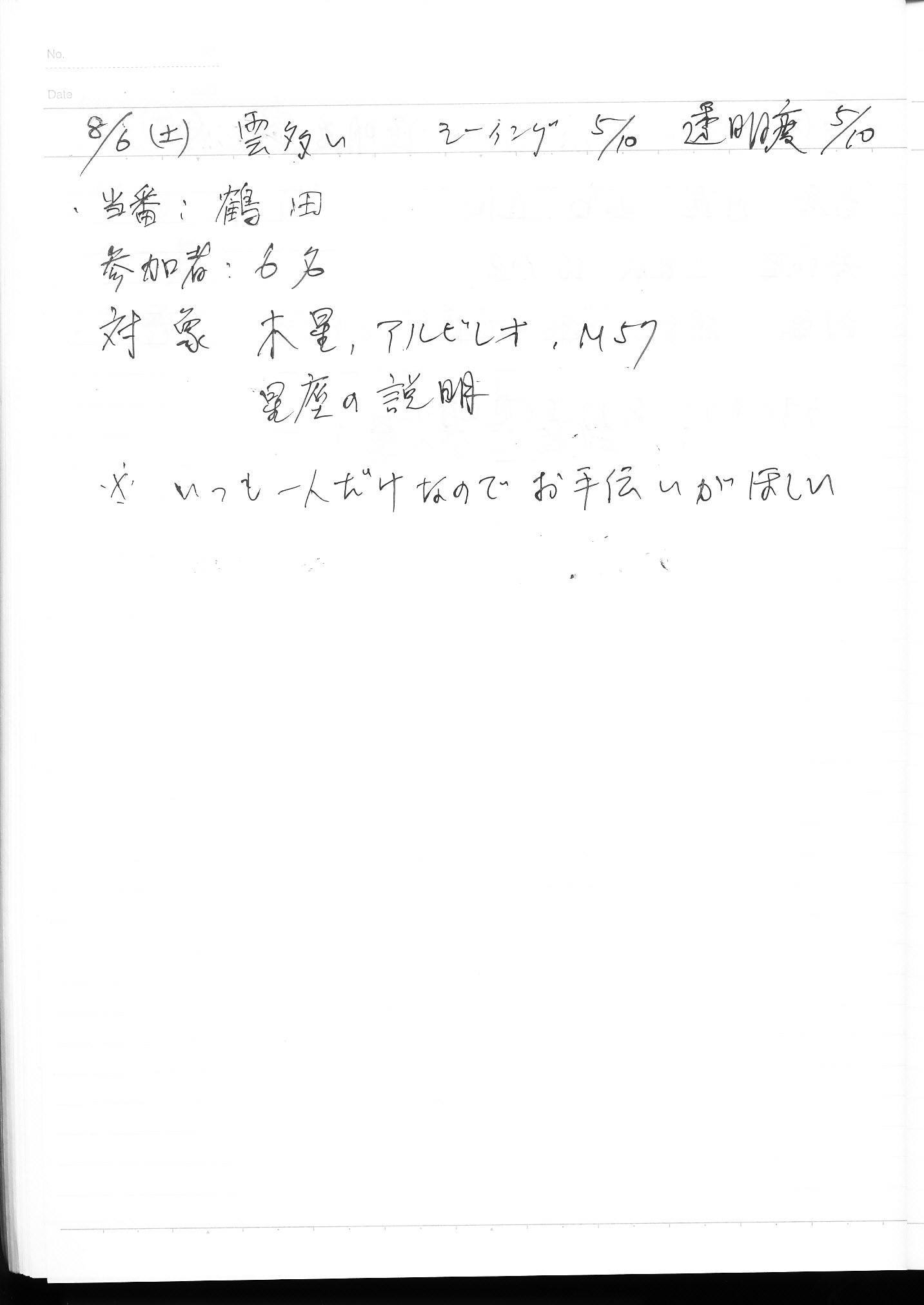 | 8月 | 6日(土) | 天体観望会 | 西与賀コミニュティーセンター | 記録ノート画像⇒ 1 鶴田 | |