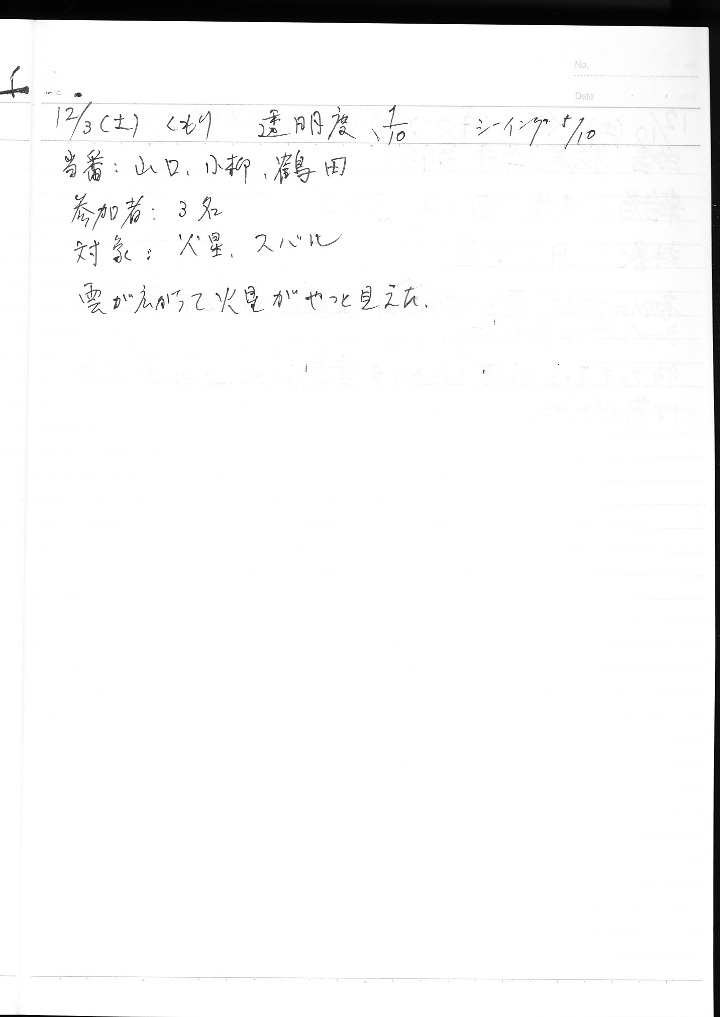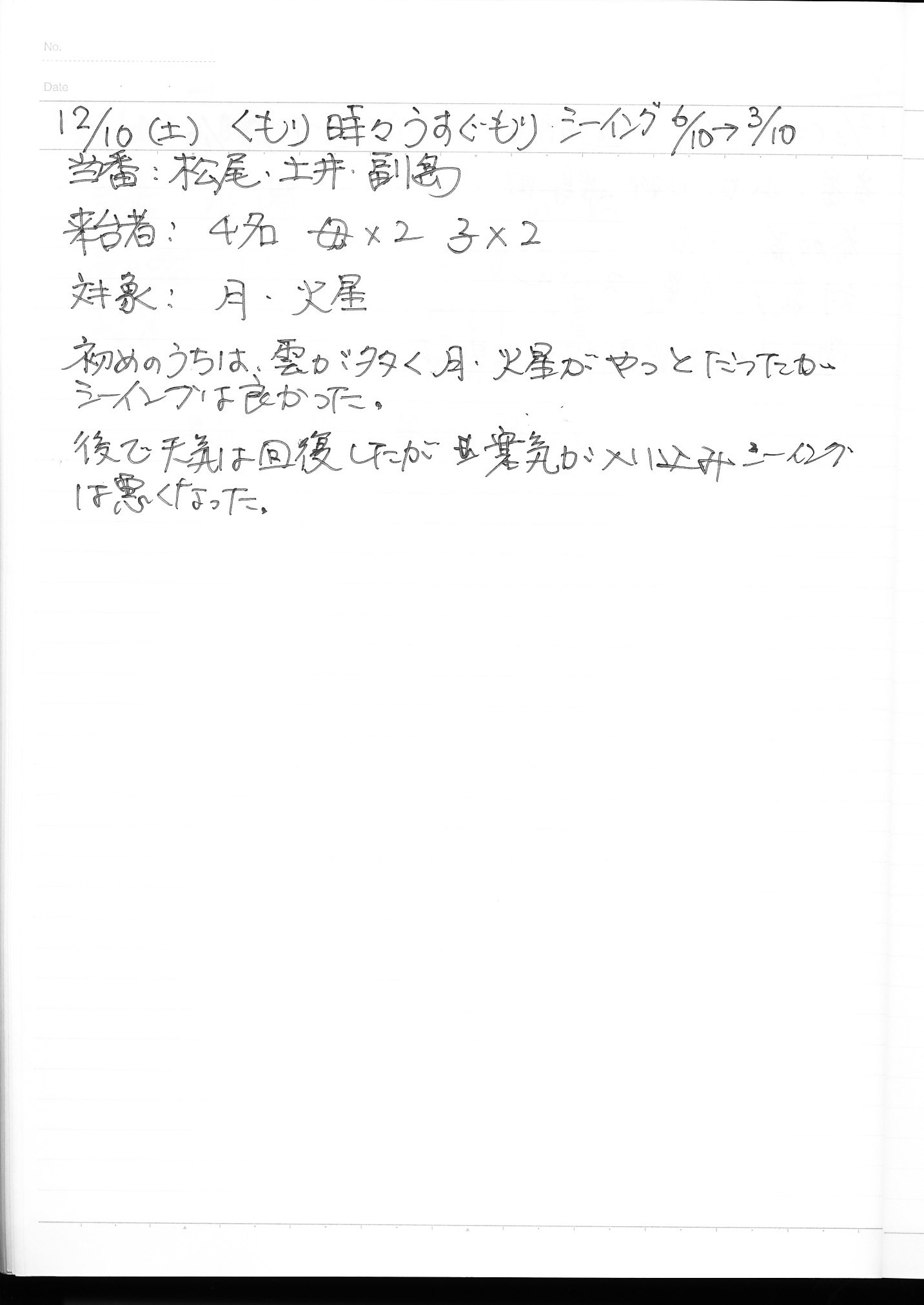 | 12月 | 3日(土) | 天体観望会 | 西与賀コミニュティーセンター | 記録ノート画像⇒ 1 山口、小柳、鶴田 | |
