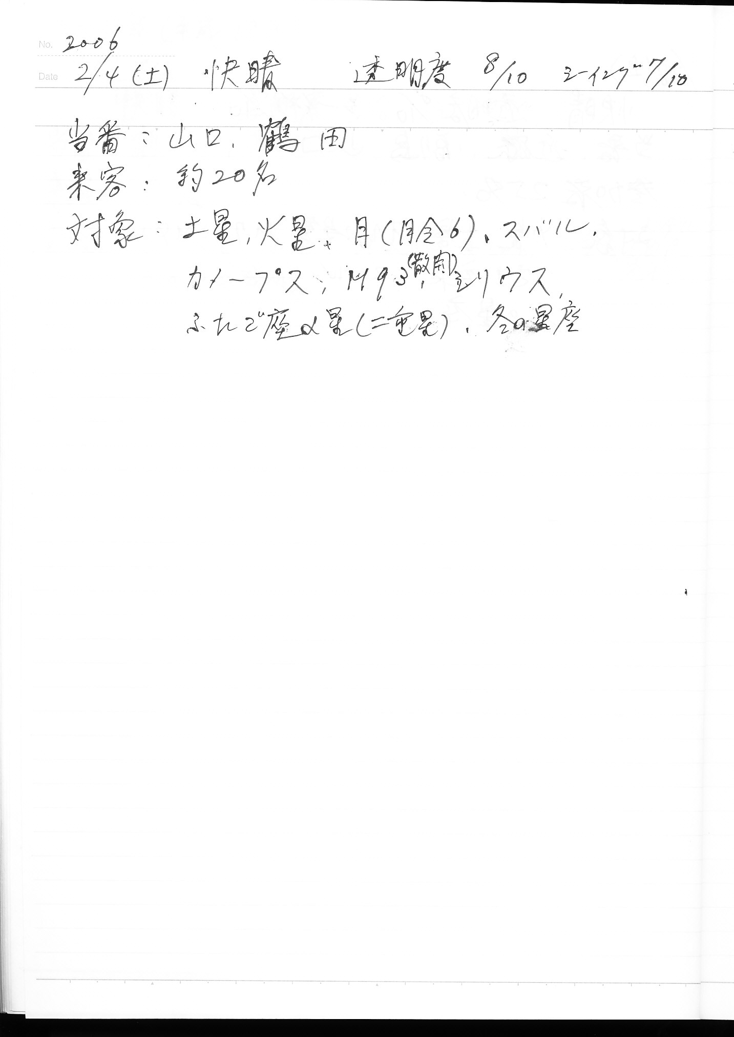 | 2月 | 4日(土) | 天体観望会 | 西与賀コミニュティーセンター | 記録ノート画像⇒ 1 山口、鶴田 | |