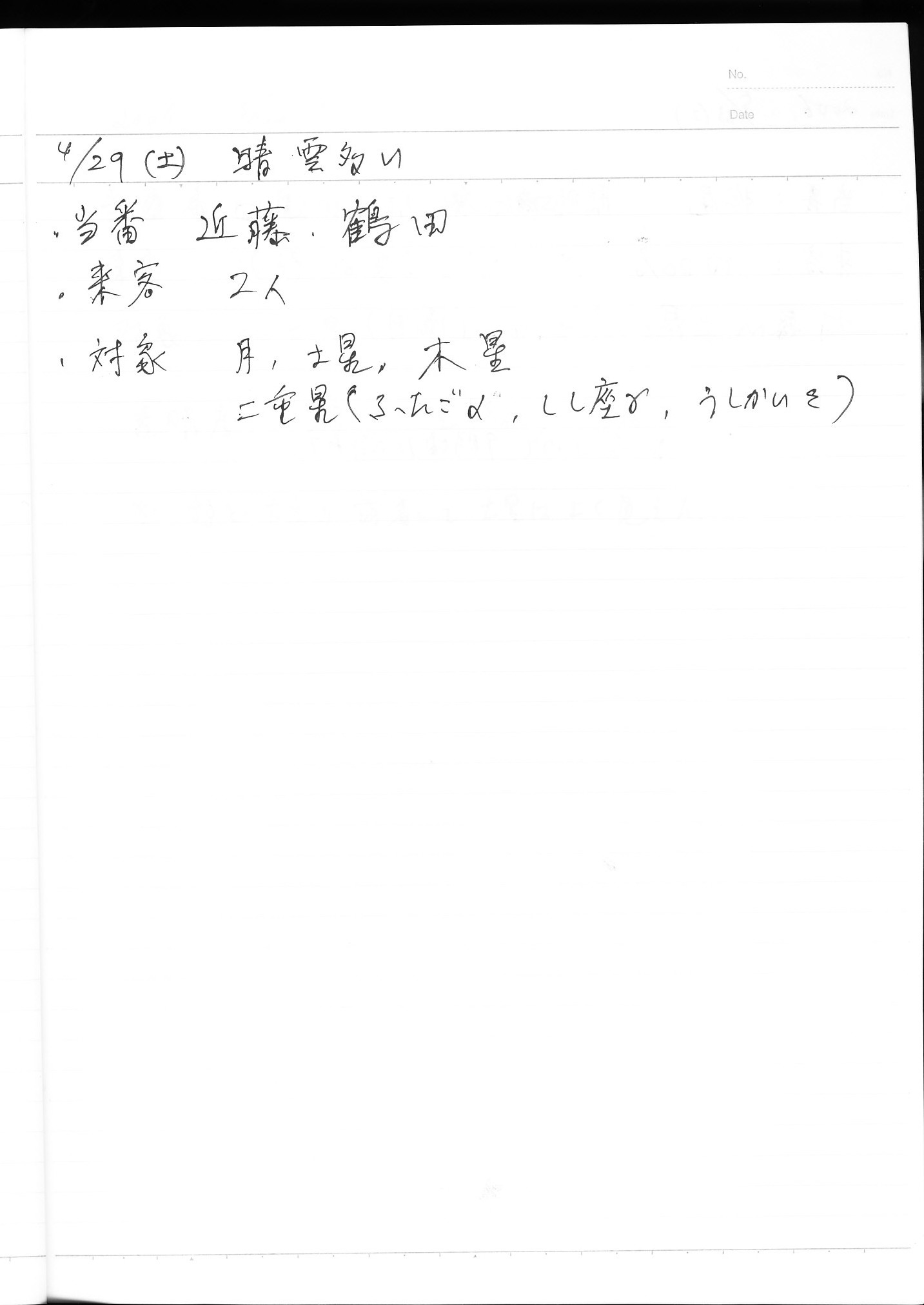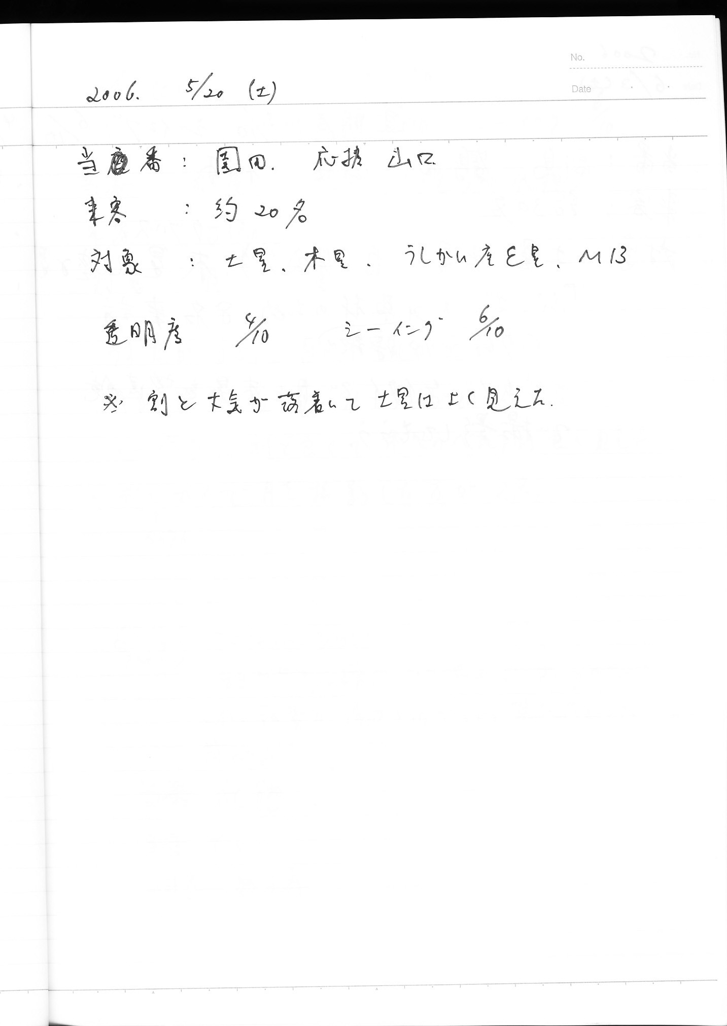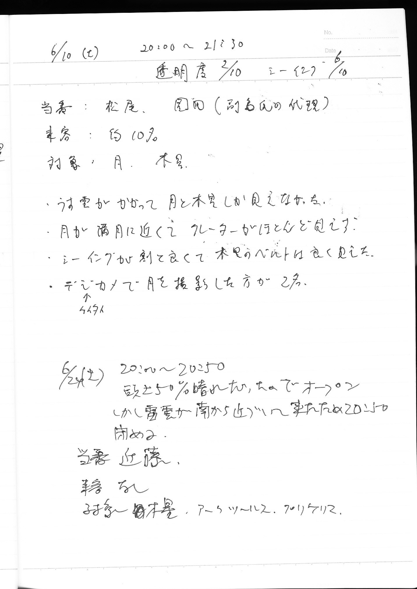 | 6月 | 3日(土) | 天体観望会 | 西与賀コミニュティーセンター | 「ぷらざ」の取材 | 記録ノート画像⇒ 1 鶴田、山口、松本 |
