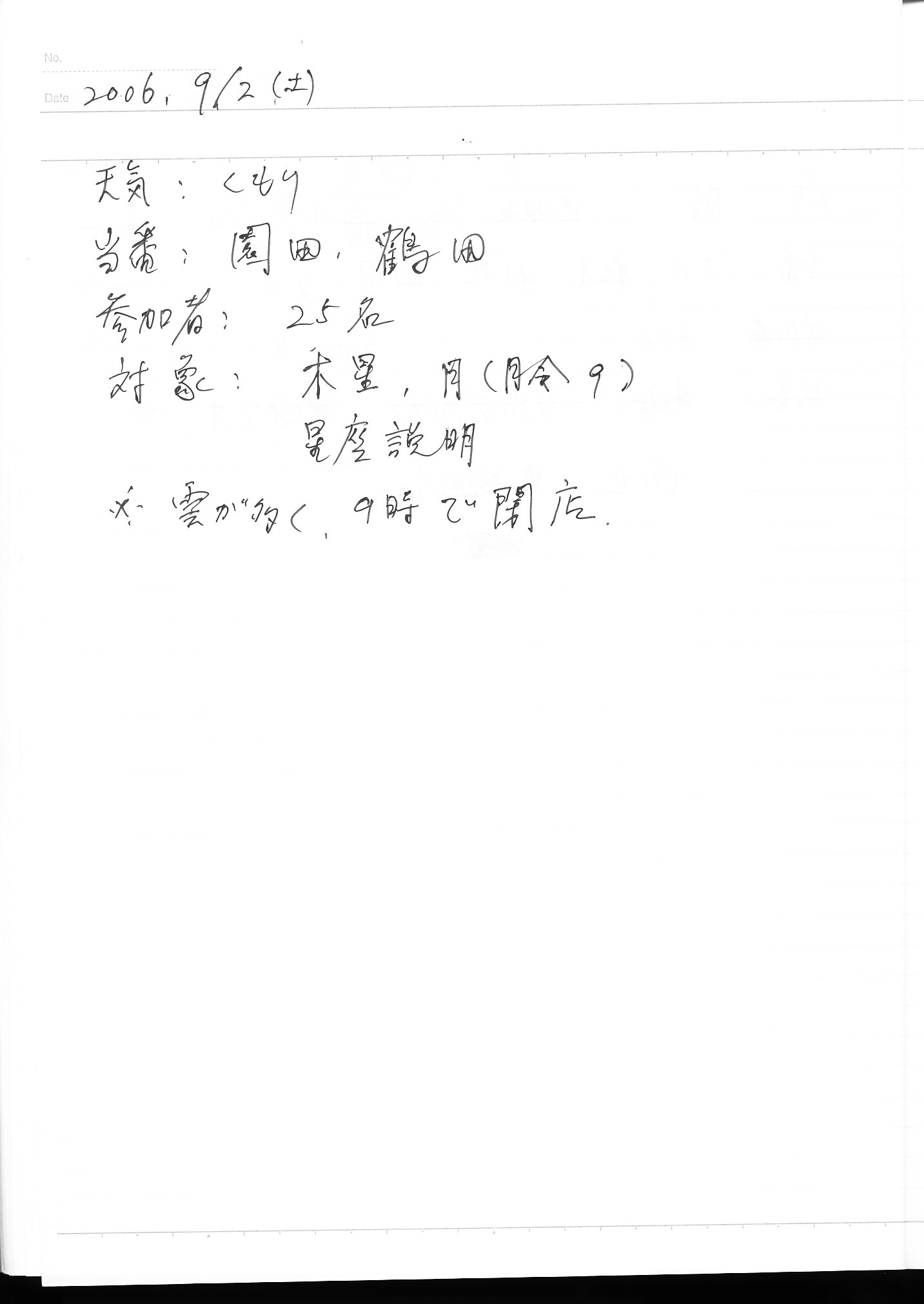 | 9月 | 2日(土) | 天体観望会 | 西与賀コミニュティーセンター | 記録ノート画像⇒ 1 園田、鶴田 | |