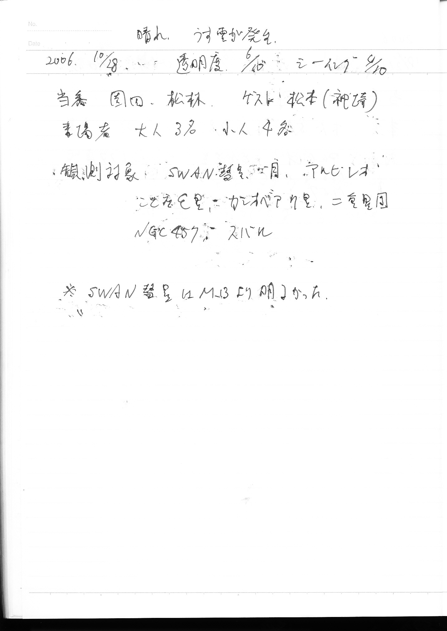 | 28日(土) | 天体観望会 | 西与賀コミニュティーセンター | SWAN彗星 | 記録ノート画像⇒ 1 園田、松林 | |