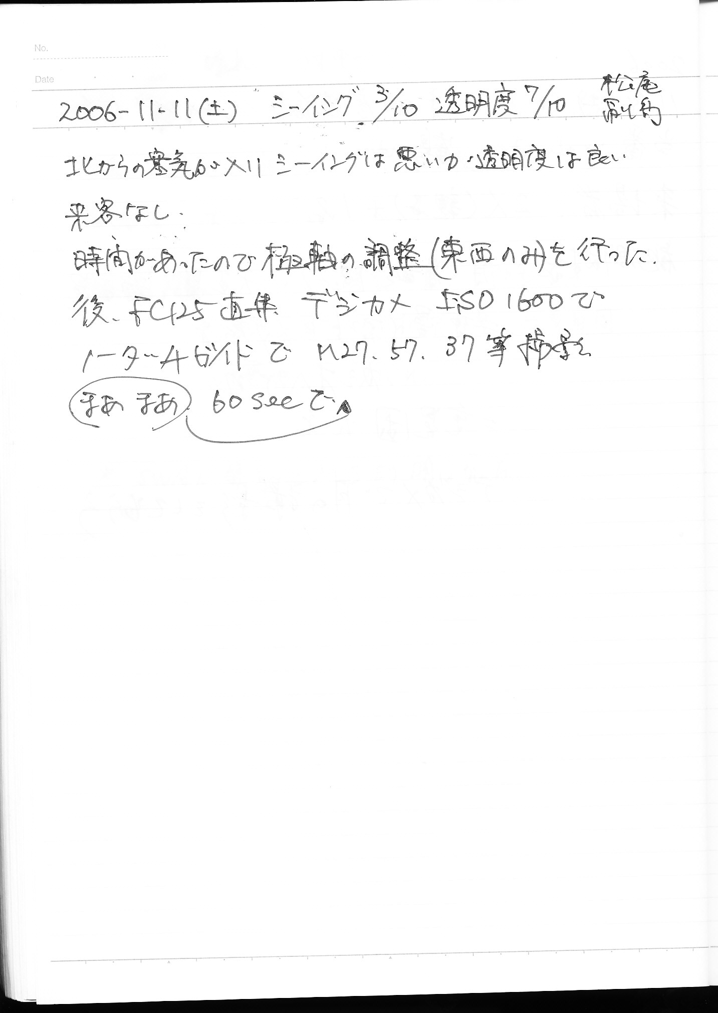 | 11日(土) | 天体観望会 | 西与賀コミニュティーセンター | 極軸調整(東西のみ) | 記録ノート画像⇒ 1 松尾、副島 | |