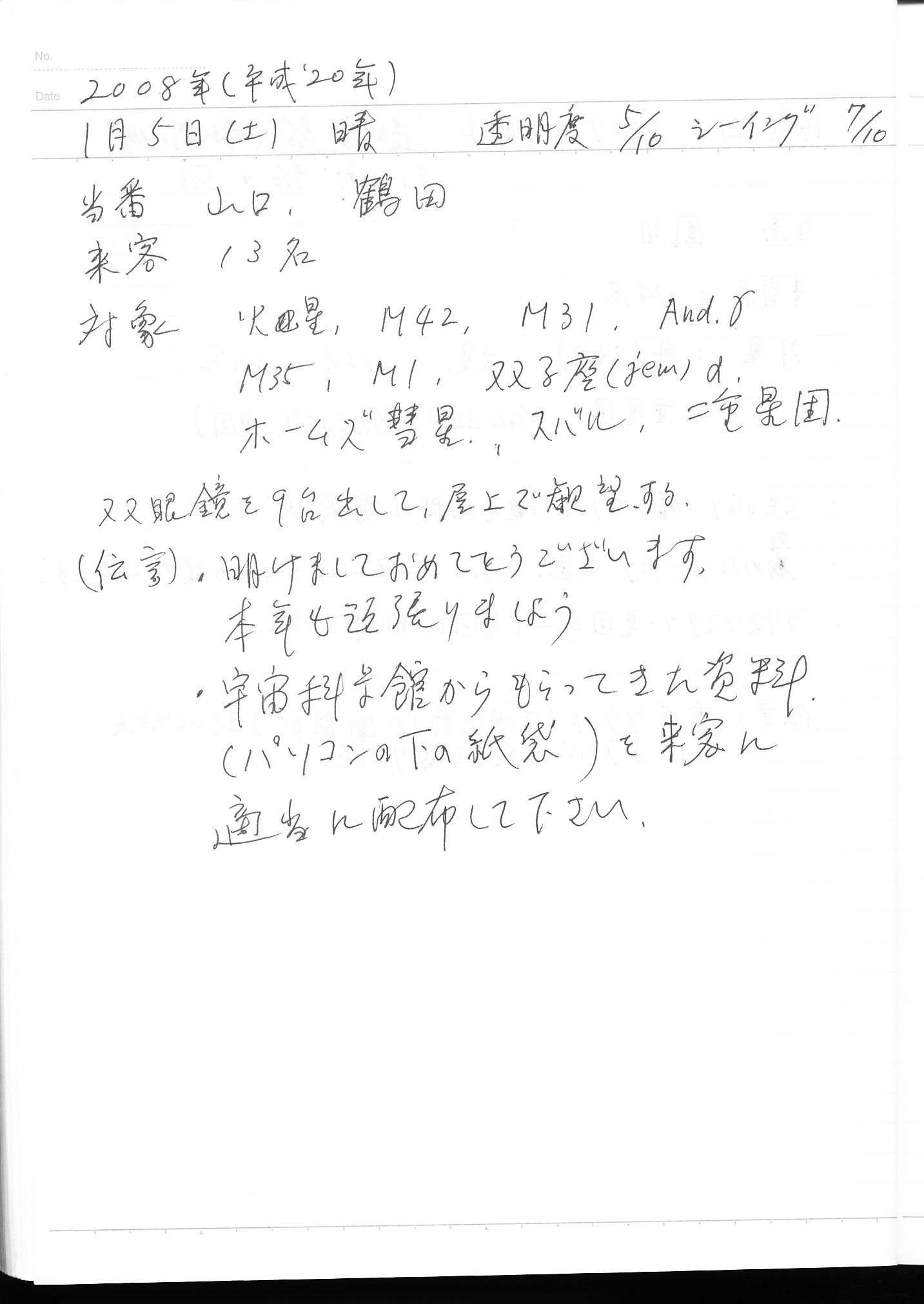 | 1月 | 5日(土) | 天体観望会 | 西与賀コミニュティーセンター | ホームズ彗星 | 記録ノート画像⇒ 1 山口、鶴田 |