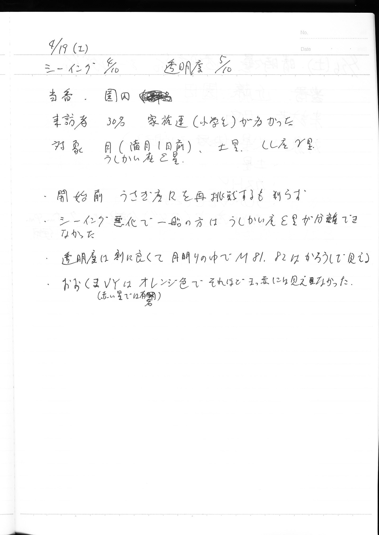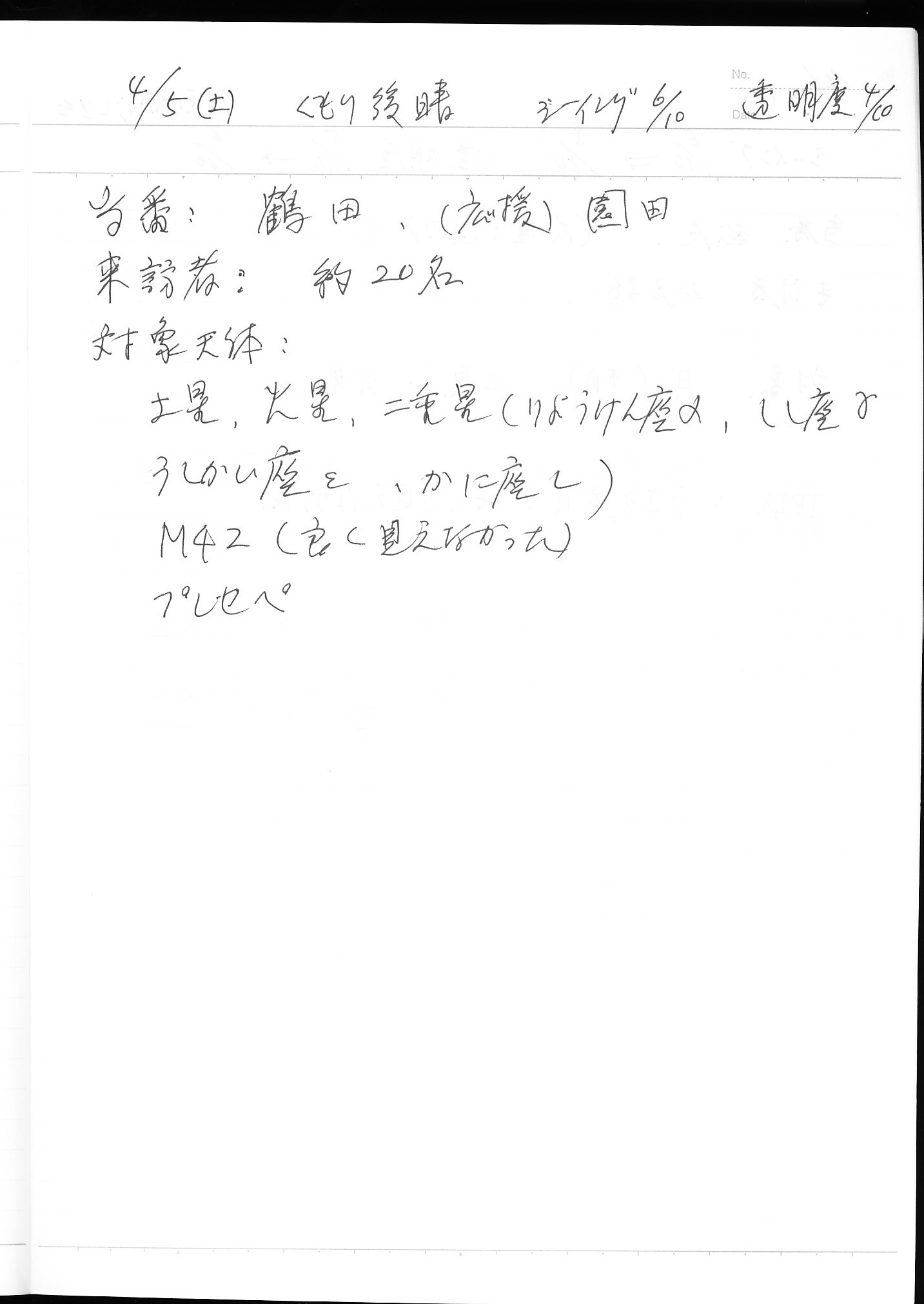 | 4月 | 5日(土) | 天体観望会 | 西与賀コミニュティーセンター | 記録ノート画像⇒ 1 鶴田、園田 | |