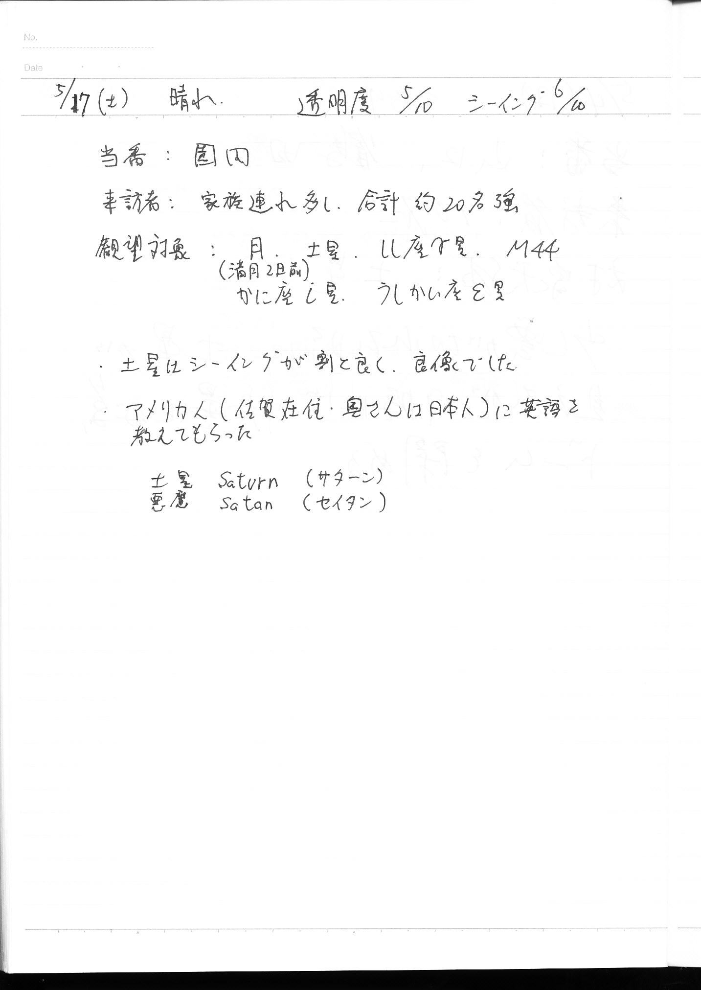 | 17日(土) | 天体観望会 | 西与賀コミニュティーセンター | 記録ノート画像⇒ 1 園田 | ||