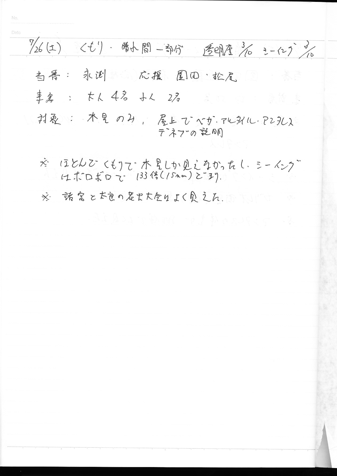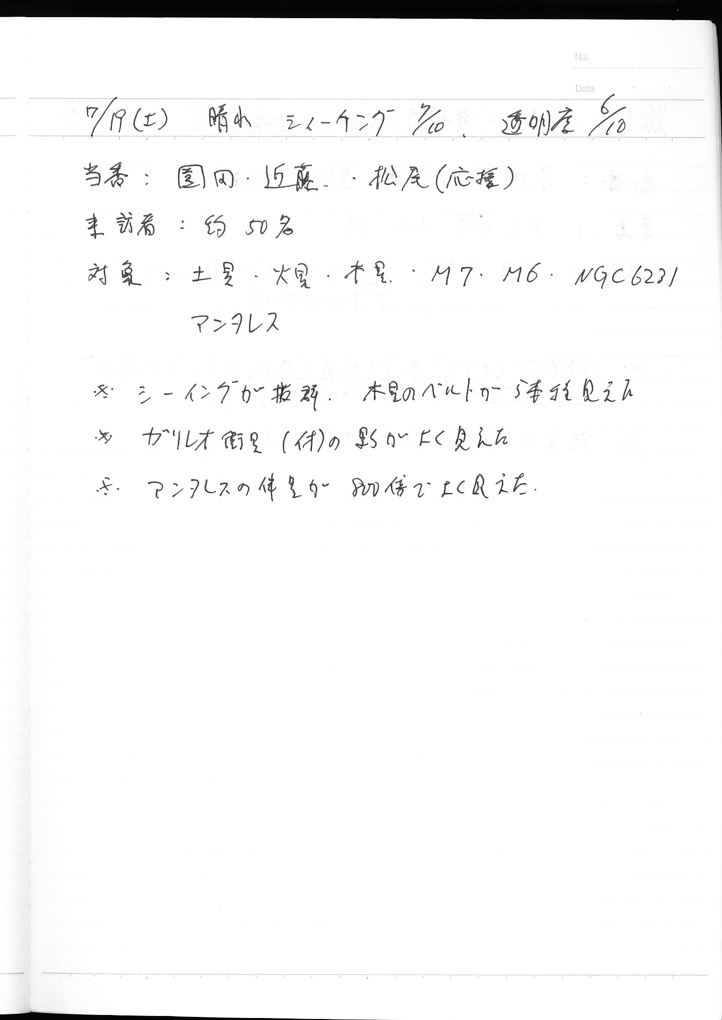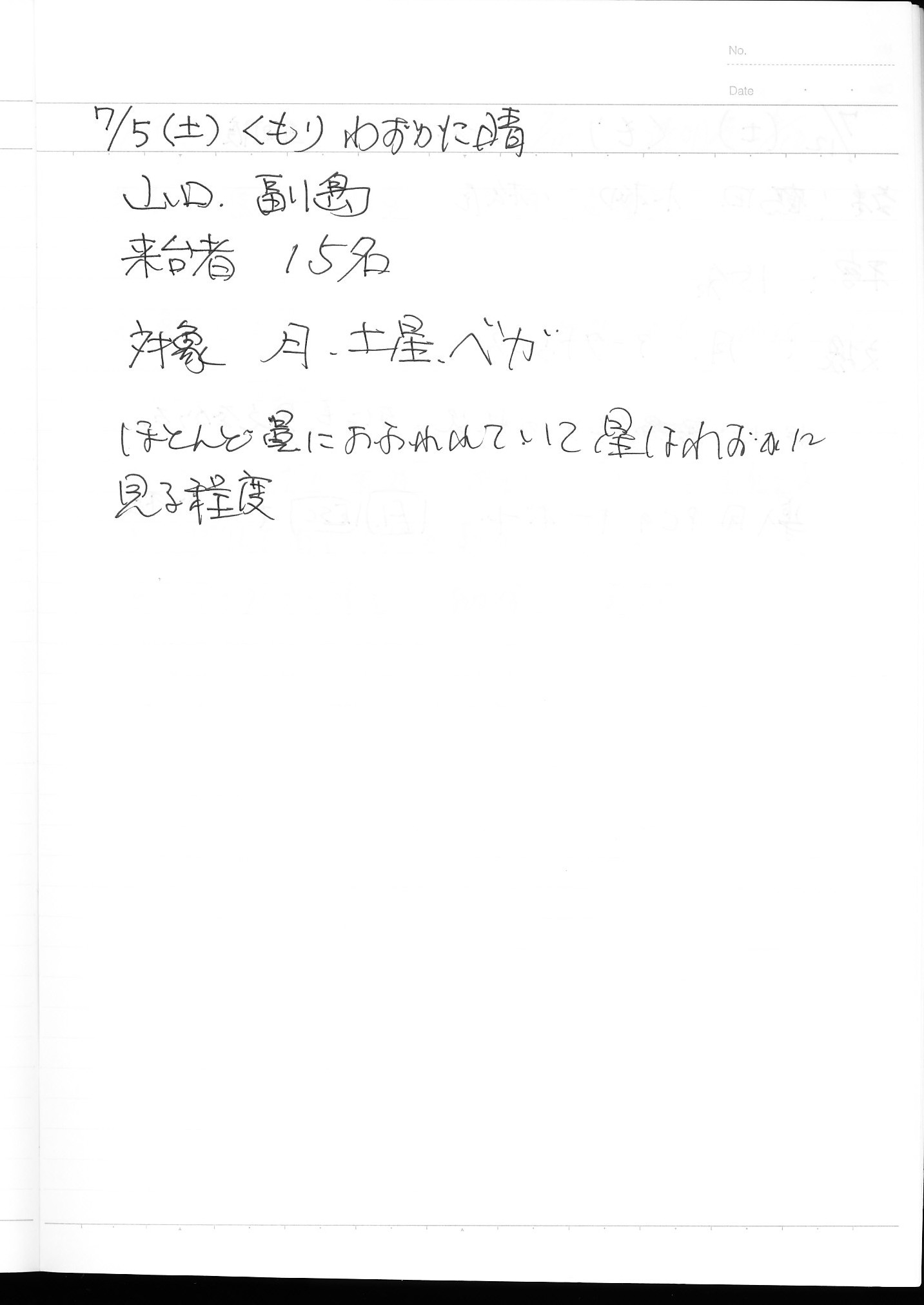 | 7月 | 5日(土) | 天体観望会 | 西与賀コミニュティーセンター | 記録ノート画像⇒ 1 山口、副島 | |