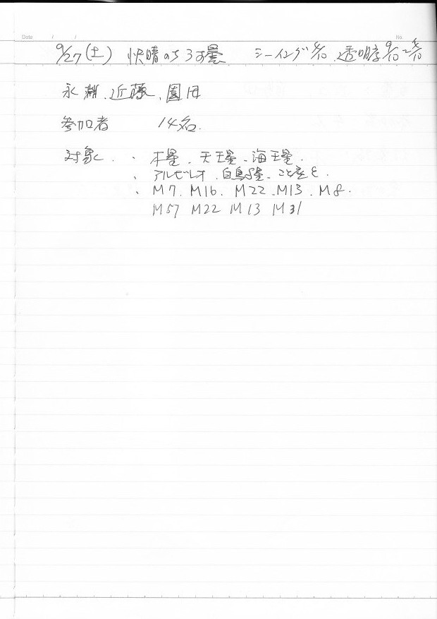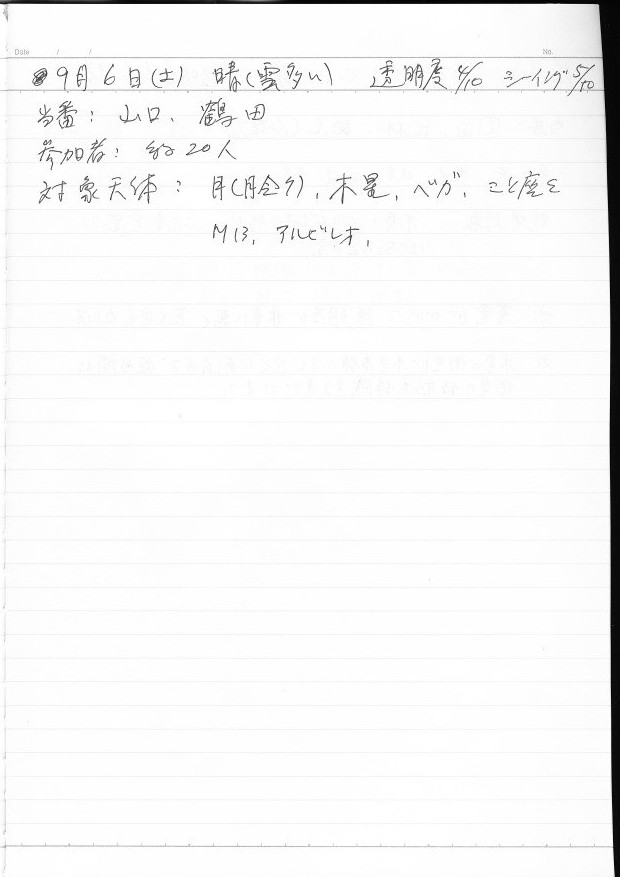 | 9月 | 6日(土) | 天体観望会 | 西与賀コミニュティーセンター | 記録ノート画像⇒ 1 山口、鶴田 | |
