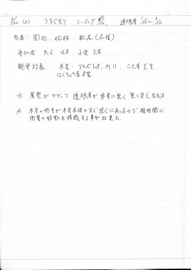 | 20日(土) | 天体観望会 | 西与賀コミニュティーセンター | 記録ノート画像⇒ 1 園田 | ||