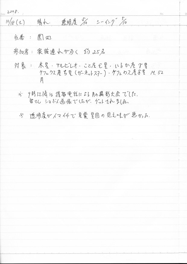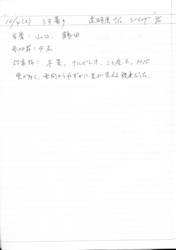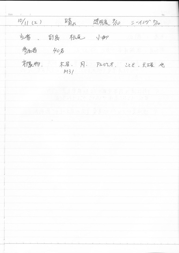 | 10月 | 4日(土) | 天体観望会 | 西与賀コミニュティーセンター | 記録ノート画像⇒ 1 山口、鶴田 | |