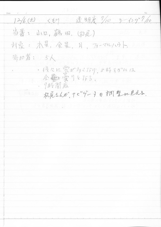 | 12月 | 6日(土) | 天体観望会 | 西与賀コミニュティーセンター | 記録ノート画像⇒ 1 山口、鶴田、松尾 | |