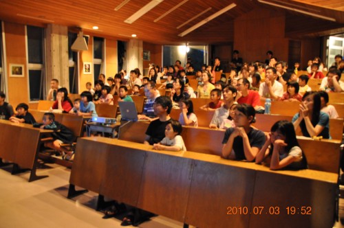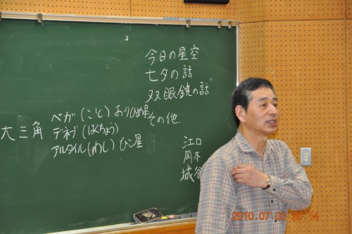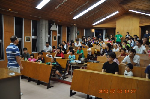 7月3日のファミリイde北山 観望会の報告です。 天気が曇りで、視聴覚室での話しでした。 内容は、副島さんからステナビで本日の星空の話、続いて近藤さんの七夕の話、園田さんの双眼鏡の話でした。 最後の質問コーナーでおわりました。 参加者は約100名+北山少年自然の家の職員数名 写真1、2、3、4、5 |