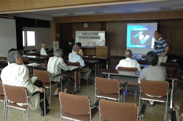 7月24日 呼子文化連盟 呼子文化連盟総会での記念講演でした。 演題「はやぶさ」でした。 小惑星、イオンエンジンのほか隕石の話など。 参加者15名 担当は副島、井手口 写真1、2、3、4、5 |